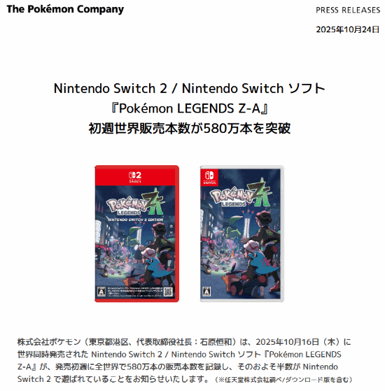 据神奇宝贝公司官方消息,首周全球销量《宝可梦传说:Z-A》,目前已突破580万。据报道,大约有一半的玩家在Switch 2 平台上玩游戏。