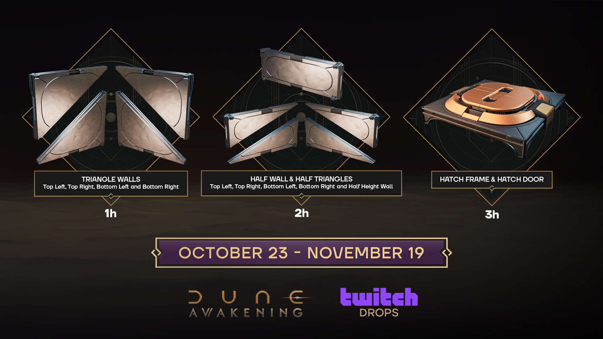 观察家风格建材不断拓展!即日起至11月19日,在Twitch平台观看任何支持掉落获取新素材的《Dune: Awakening 沙丘:觉醒》直播。