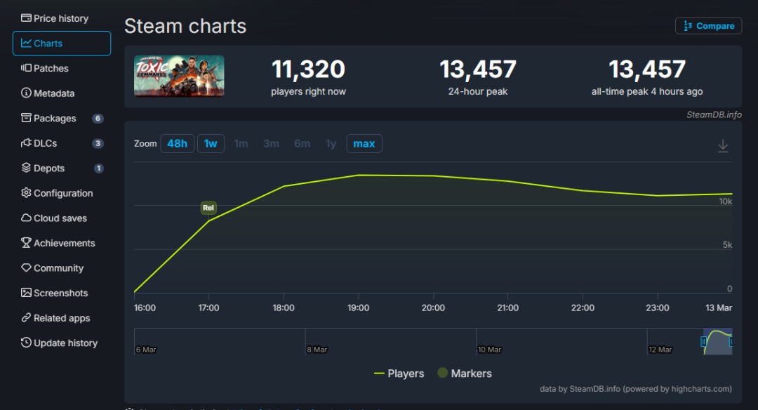 SteamDB 显示《毒液突击队》。 Steam 在线人数峰值为13,457 人。游戏支持简体中文: