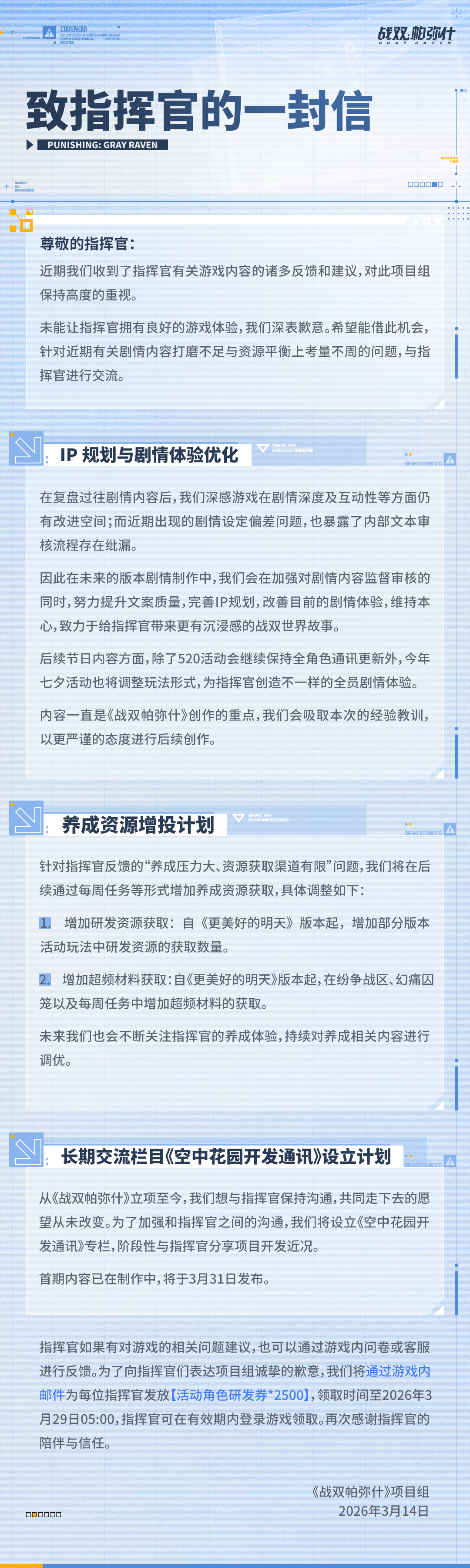 为了表达项目组对各位指挥官的诚挚歉意,我们将通过游戏内邮件的方式向每位指挥官发放【活跃角色研发券*2500】。兑换时间为2026年3月29日05:00,指挥官可在有效期内登录游戏领取。再次感谢指挥官的陪伴和信任。
