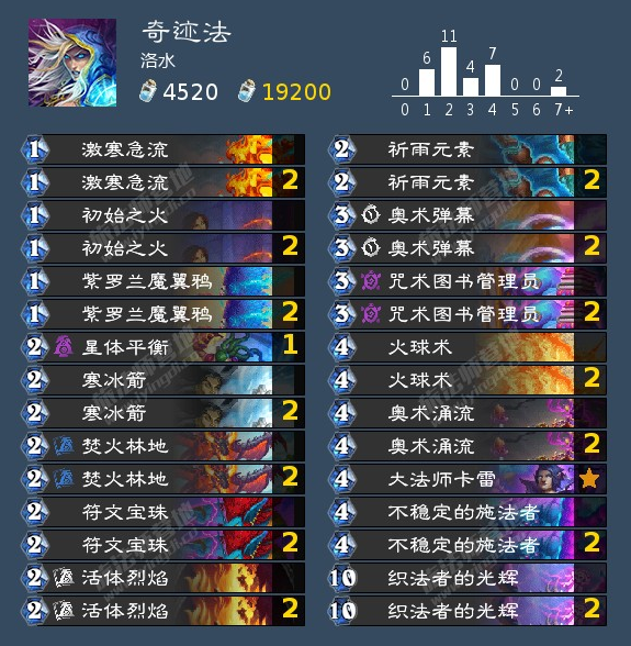 这套法师是基于现有新卡牌打造并经过试玩测试的一套直接伤害法师。这套奇迹法的赢点既有靠法术伤害直伤赢得对局,还可以靠10费法术织法者的光辉,进行一波返场,从而凭借场面取胜。套牌的核心是大法师卡雷。如果你在大多数游戏中按时4费打出大法师卡雷,那么你有很高的概率以一张牌获胜。它带来的高收益主要体现在奥术弹幕、冰冷急流、奥术涌动等卡牌上。比如,buff后裂变的两部分奥术涌动都会获得法术强度,整体奥术弹幕会多造成3点伤害。该套牌的抽卡系统由三张牌组成:燃烧林地、法术图书馆员和活焰。其中,活焰不仅可以取回卡牌库的燃烧树林,还可以为法术图书馆员提供延伸效果。前期我们需要利用元素系统来铺场,同时查卡。中期我们利用大量低成本直接伤害的魔力效果和0成本6/6站位压制对手。中后期,我们使用高成本的直接伤害法术来结束比赛。而留牌思路方面,不论先后手,留下卡组核心大法术卡雷,紫罗兰魔翼鸦,焚火林地,乌鸦以及活体烈焰。奇迹法术作为新版本的主系统,与元素系统的结合是比较成功的。前中期可以一边查牌一边扩大场地,中后期可以使用法术直接击杀。适合喜欢操作比较频繁的玩家。