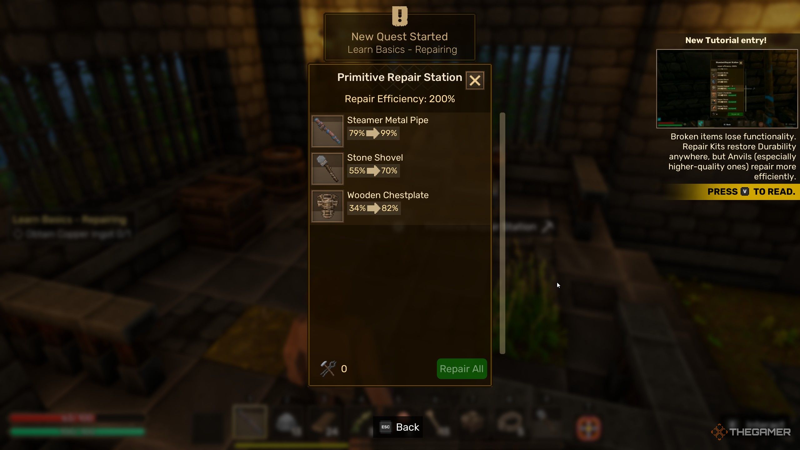 当然,您需要工具、武器和盔甲都有一个耐久度指标,不仅是为了增加功率输出和减少退化时间,而且在您拥有更好的材料和时间来制作升级所需的一切之前,您需要尽可能升级你的装备以便根据需要修补您的装备。
