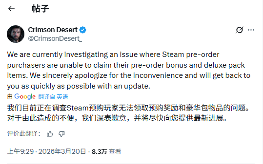 《红色沙漠》于3月20日正式上线,数据显示,该游戏在Steam平台最高同时在线人数达到239045人。同时,有玩家反映无法领取预购奖励和豪华版礼包,开发商Pearl Abyss已对此展开调查。