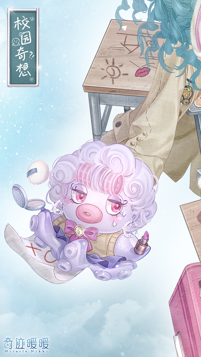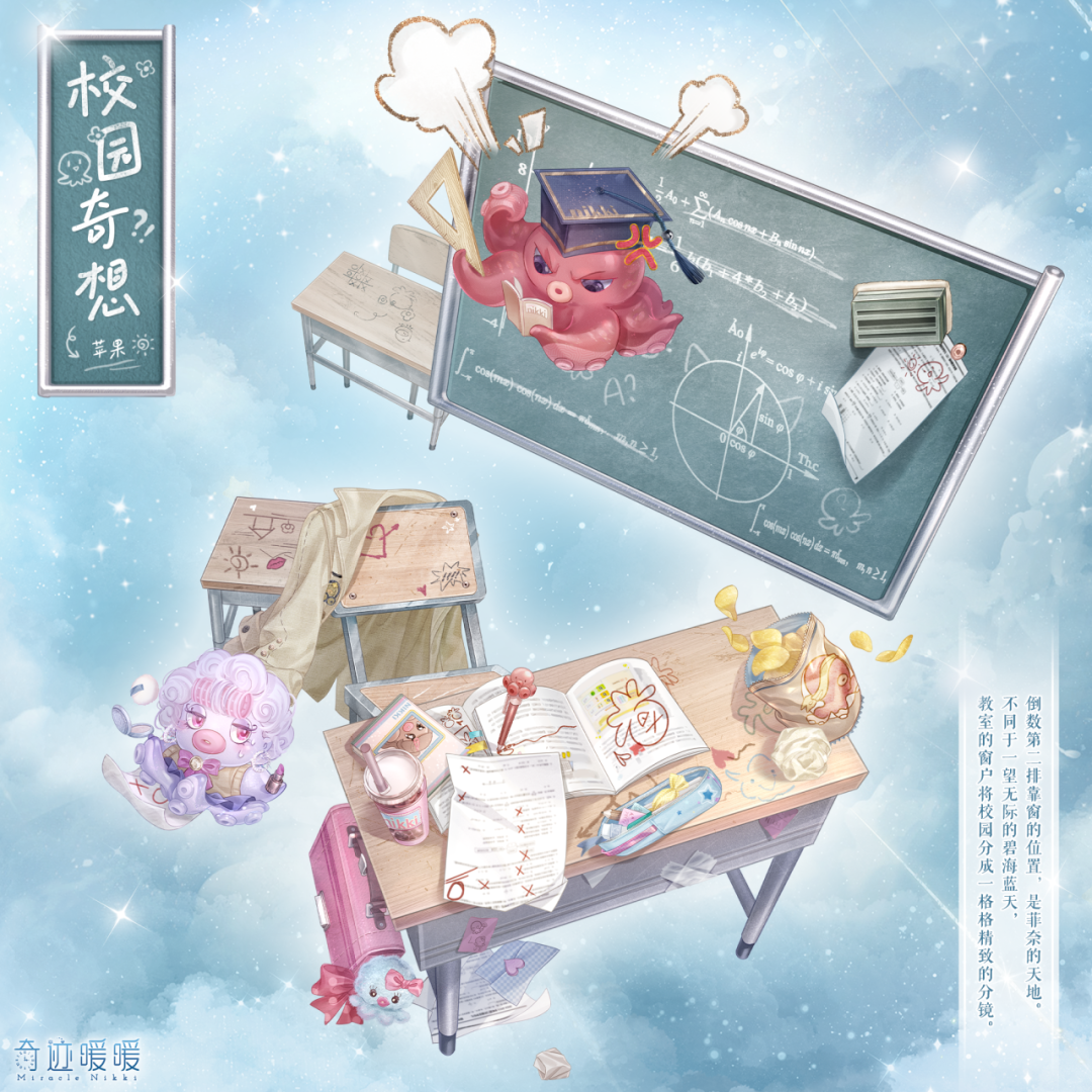 【校园奇想】包括正常姿势和特殊姿势,全新妆容“心累”、卡通面饰“心愿贴”、精美可移动摆件“班助”、“题海漩涡”、“凌乱书桌”、“倾倒梦想”。