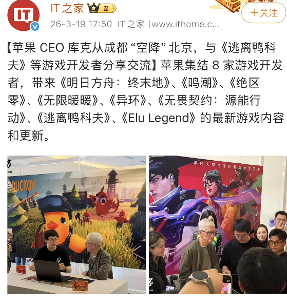 近日有人在论坛上发帖称宋伦从奔铁大厦出来,在论坛上引发了一波讨论。首先,有人怀疑这是一张P图。后来有玩家认出,与宋伦合影的老师是一位65岁的DNF高手氪金小伙。渐渐地,大家都认为二线选手之间的友好交流是正常的。然而!我真正想要的最后一件事是!库克再次访华。此次,邀请了多位游戏公司CEO下线。于是,大家就在一起了,就产生了这个误会~