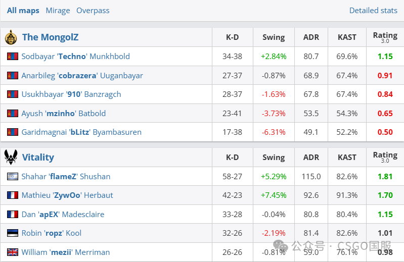 胜者组:Vitality 2-0 MongolZ,晋级胜者组决赛。在图1蒙古人选择的幻影上,蒙古队被打得毫无还手之力。 “白色闪电”叔叔的狙击又快又准,元气轻松领先。来到图2的Overpass,虽然火仔和沙鹰在1V2中卷土重来,但Vitality在4V1中也因为包裹上的shi而没来得及释放包裹,这相当是法国队的遗产;半场结束,蒙古队8-4领先。换边后,大黄蜂在flameZ的爆发力表现下迅速反击。 Sushu在A点单独击杀4次,apEX在B点关键击杀3次,活力成功追上加时,并在加时赛中力压对手完成逆转,晋级胜者组决赛。