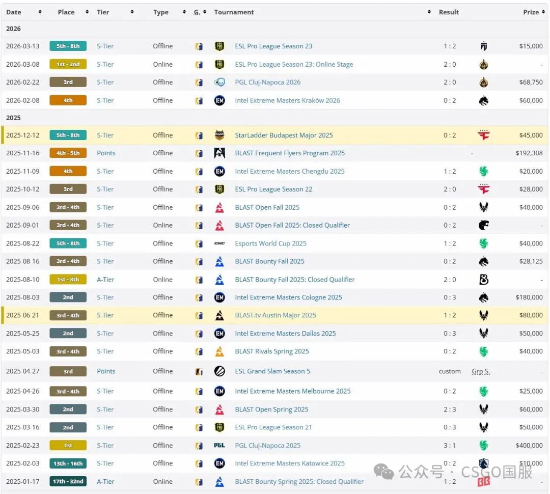 他们上一次止步小组赛还是在2025年初的IEM卡托维兹。当时MOUZ刚刚在BLAST赏金赛S1中爆冷输给了BB。他们选择委托siuhy并让Brollan转而指挥。青训球员谢莱克斯临时替补上场。在MOUZ在卡托维兹两场比赛0-2输给GamerLegion和Liquid并被小组淘汰后,他们正式宣布招募到Spinx。这也意味着本次BLAST鹿特丹公开赛是MOUZ自Spinx加盟球队以来首次在小组赛中被淘汰。