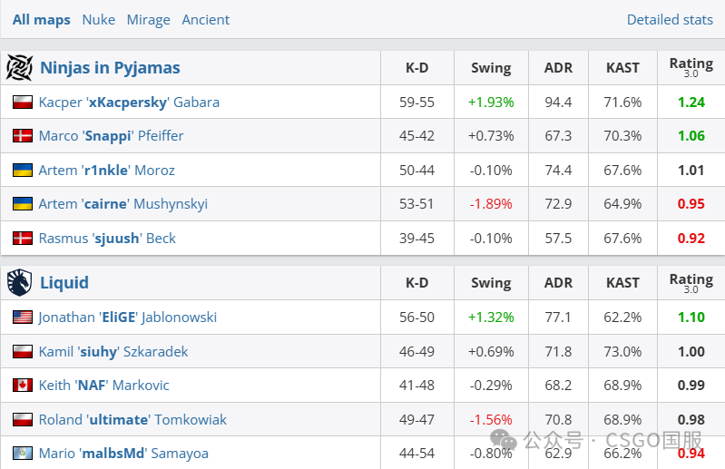 决胜图Ancient,NIP拿下手枪局,立刻被翻盘。小福和季哥带领Liquid打出8-2的铁血防守。虽然Liquid在手枪局换边再次落败,但Liquid在长枪局发起5-2攻击波结束比赛。