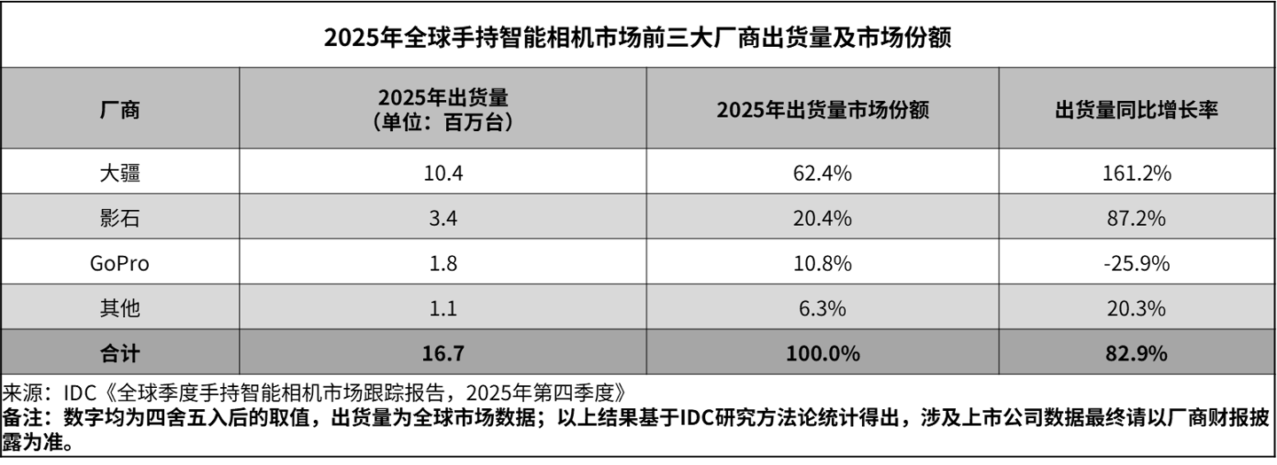 需要注意的是,国际数据公司(IDC)3月21日最新发布的《全球季度手持智能相机市场跟踪报告,2025 年第四季度》显示,2025年全球运动相机出货量将突破800万台,同比增长61%。大疆创新和ShadowStone都凭借自己的热门产品取得了不错的成绩,跻身市场前两名。