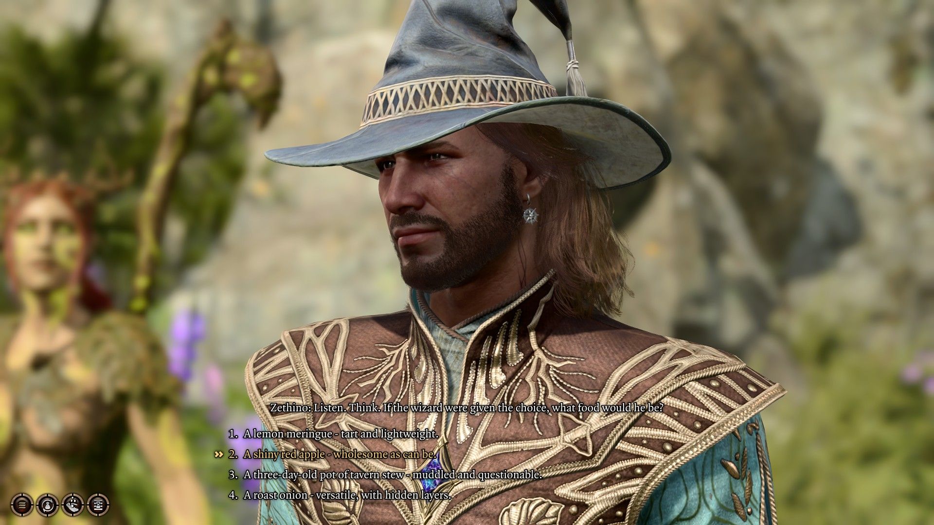 闪亮的红苹果—— 再健康不过了。+1烤洋葱—— 用途广泛,层次丰富。+1在他位于深水城的阳台上。+2他认为如果他死了,他和世界可能会更好。+2哈辛
