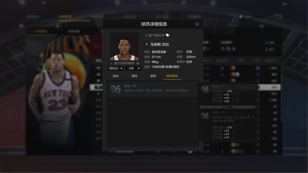 坎比可以与艾弗森、基特尔斯组成“黄金一代”球员,篮板球数值大幅提升。