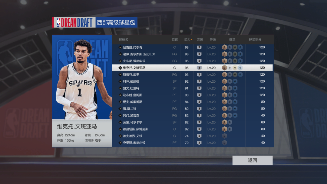 卡槽2 西部联盟高级明星包:160 星点。在星包选择界面上滚动鼠标滚轮就会出现。毕业球员包括文班、库里、杜兰特、阿门、科怀、詹姆斯。他们主要是非战术攻击体系中的射手。在雷阿伦的战术进攻体系中,文班具有主控属性,会抢球打断篮网队的战术。基本上只有阿门才能使用。卡池玩家众多,价格昂贵,流失率高,发展不快。雷阿伦的战术进攻体系不推荐。想要打造非战术攻击主动套装的玩家可以考虑一下。