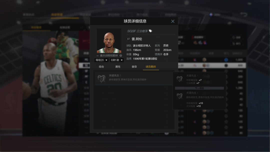 球员联结:上一期组建了以弗拉格、07雷阿伦、克努珀、马库斯坎比为核心的战术进攻体系球队后,细心的兄弟可能已经发现,雷阿伦可以与费舍尔形成“关键之师”的球员联结,大幅提升投篮值。