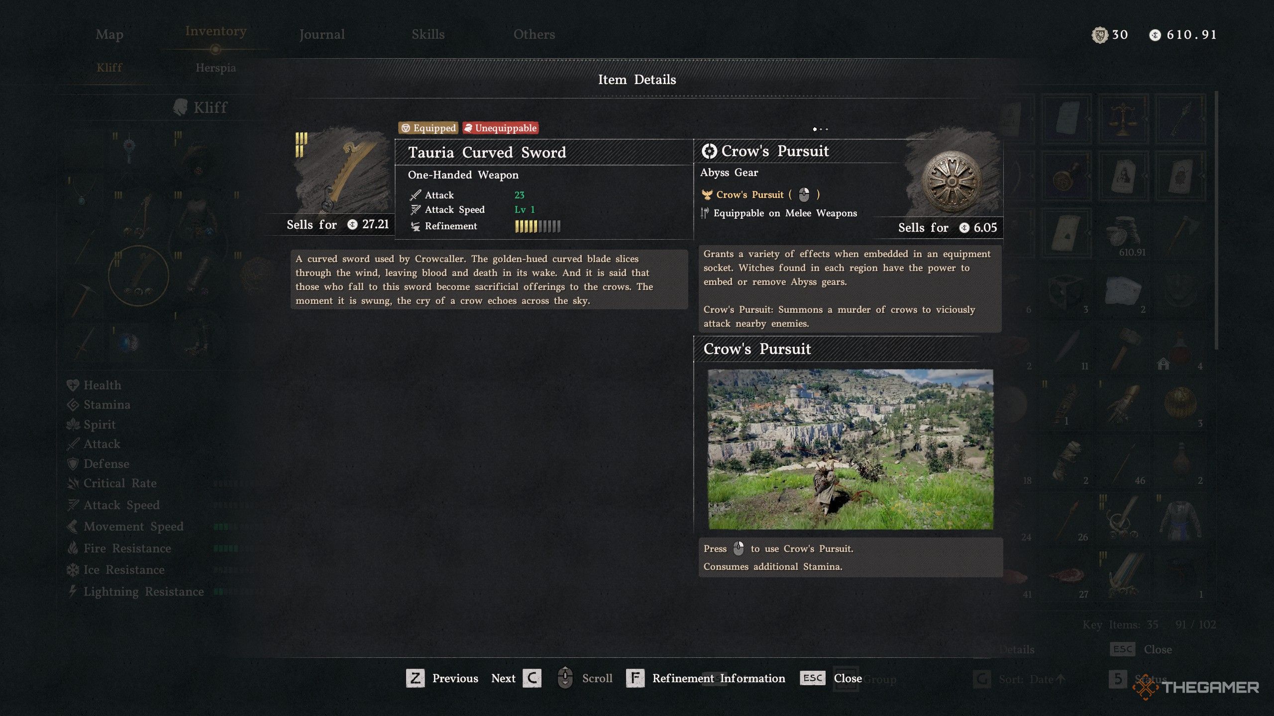 至于剑本身,托里亚曲剑拥有攻击速度和攻击力+1的深渊装备槽位,以及其固有特性“鸦群追击”。功能会在你进行猛烈攻击时从剑刃上释放出一群乌鸦,对附近的敌人进行俯冲轰炸。这是对抗多个敌人的强大武器,因为当你攻击时,乌鸦可以迅速聚集并干掉其他敌人。然而,它并非理想的Boss战武器,因此我确实建议为那些战斗准备类似“暗黑使者”这样的武器。