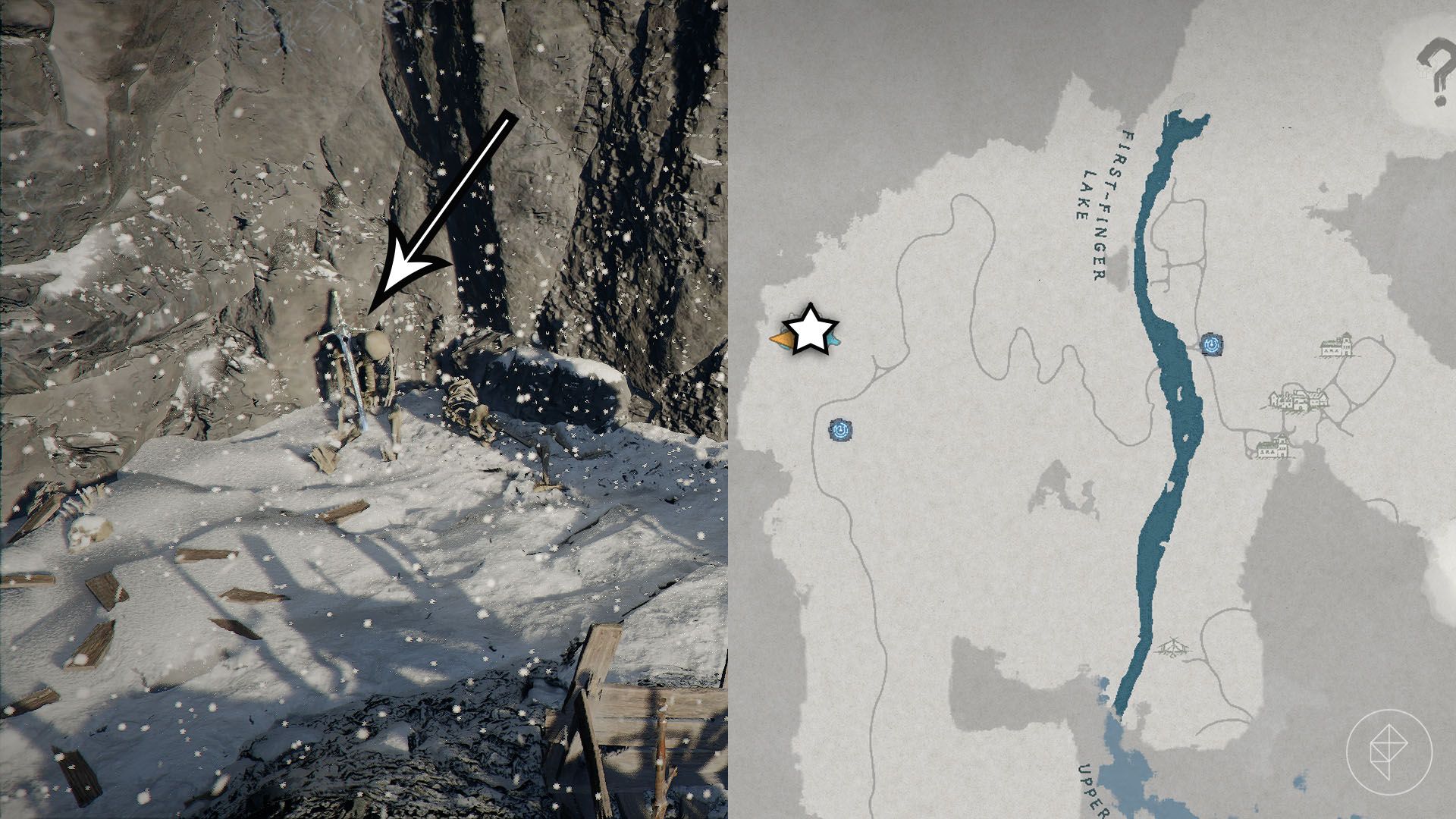 从村里的深渊传送点,穿过河流,沿着道路前行直到出现岔路。走右边,通过岩石之间的狭窄通道,你最终会进入一个大营地,地上插着许多剑。该区域就像一个废弃的战场,剑在西侧、靠在石墙边的一具骷髅旁。