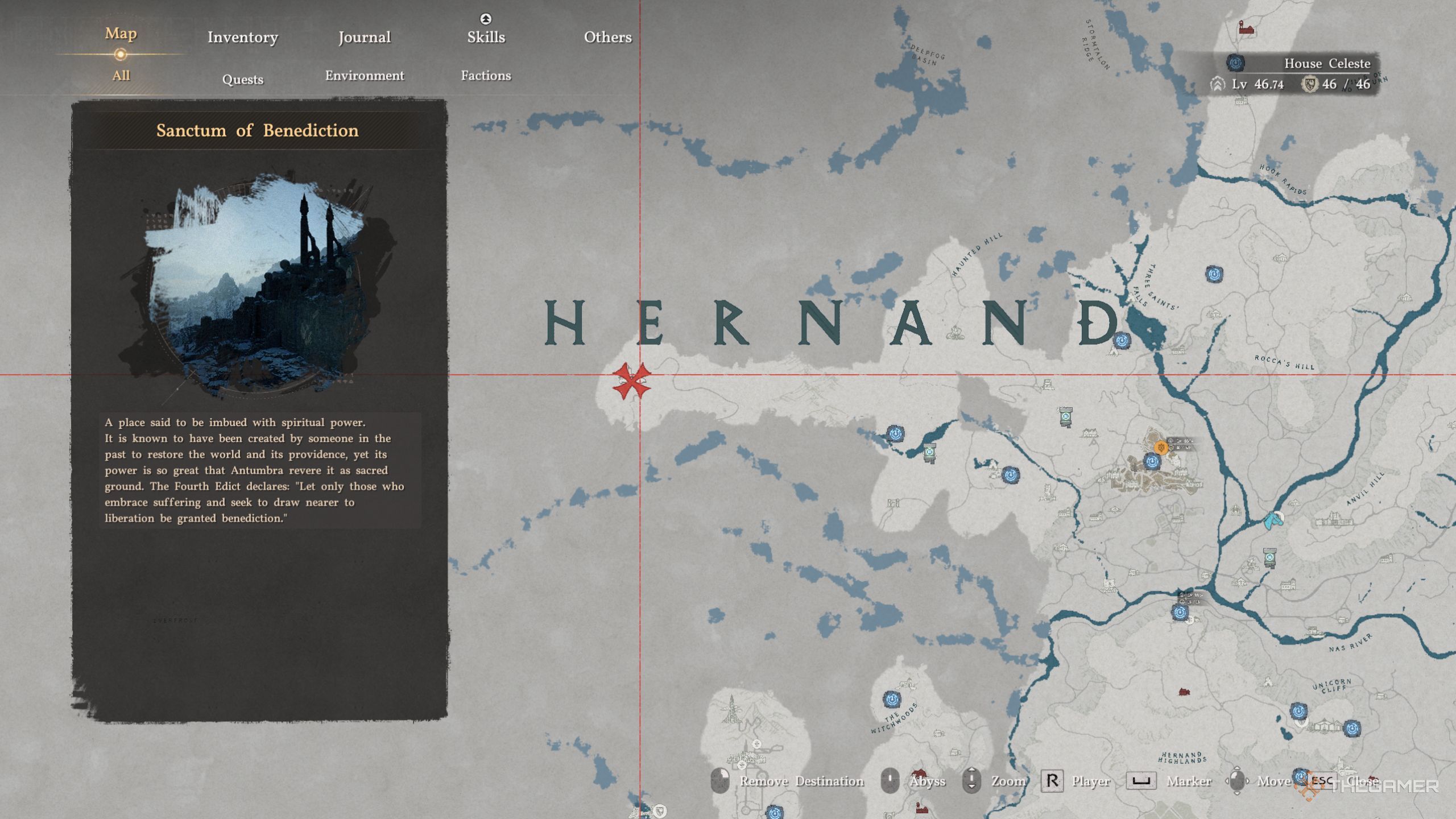 当您完全缩小《红色沙漠》 地图时,您会看到粗体的“Hernand”,因为它是游戏的主要区域之一。如果您正在寻找祝福庇护所,您可以拨打在地图上赫南德“E”字母的正下方找到它。如果你在接到任务后就想清理庇护所,那么这很可能是你尚未探索过的区域。