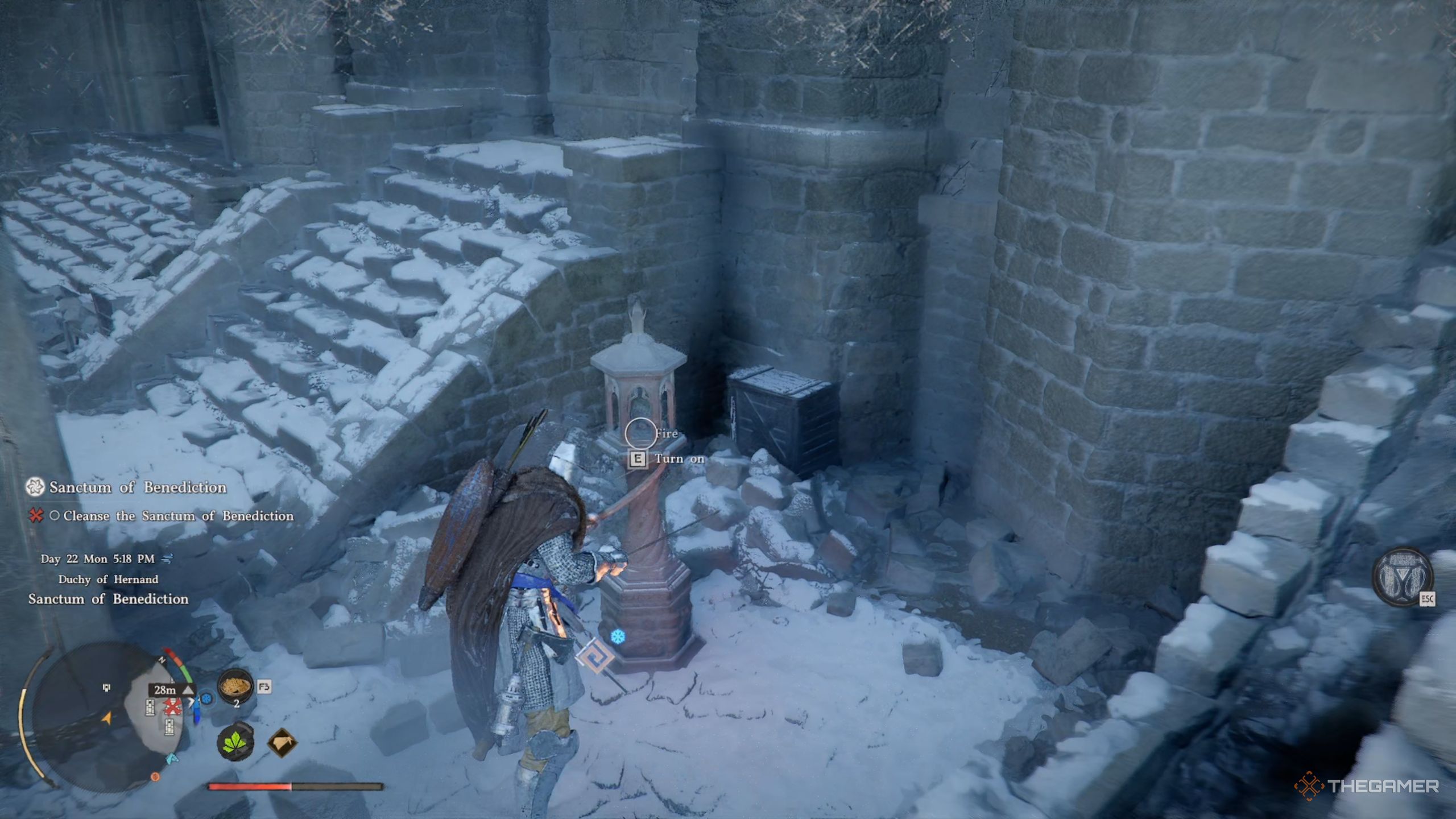 一旦你到达祝福圣所,你会注意到这里的主要问题之一是它被雪覆盖,这意味着除非你有一些抗寒的衣物,否则你很可能会感到寒冷。这会增加你的耐力消耗并减慢恢复速度,可能会使战斗变得更加困难。
