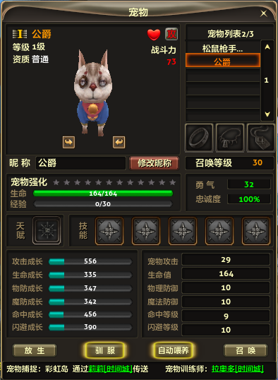 从资质到技能,一步步饲养宠物。宠物的品质取决于几个方面。资质从普通到完美分为五个等级。资质越高,能够成长的上限就越高。成长会影响特定的属性值。如果攻击成功,则被击中时会受到伤害;如果防御成功,就会抵抗殴打。天赋是变异宠物才有的东西。如果幸运的话,可以孵化出具有特殊天赋的婴儿。