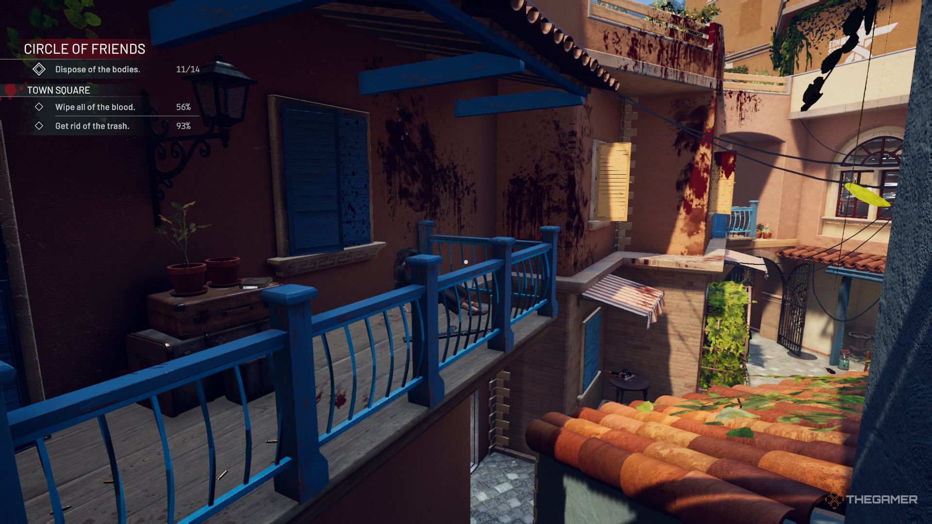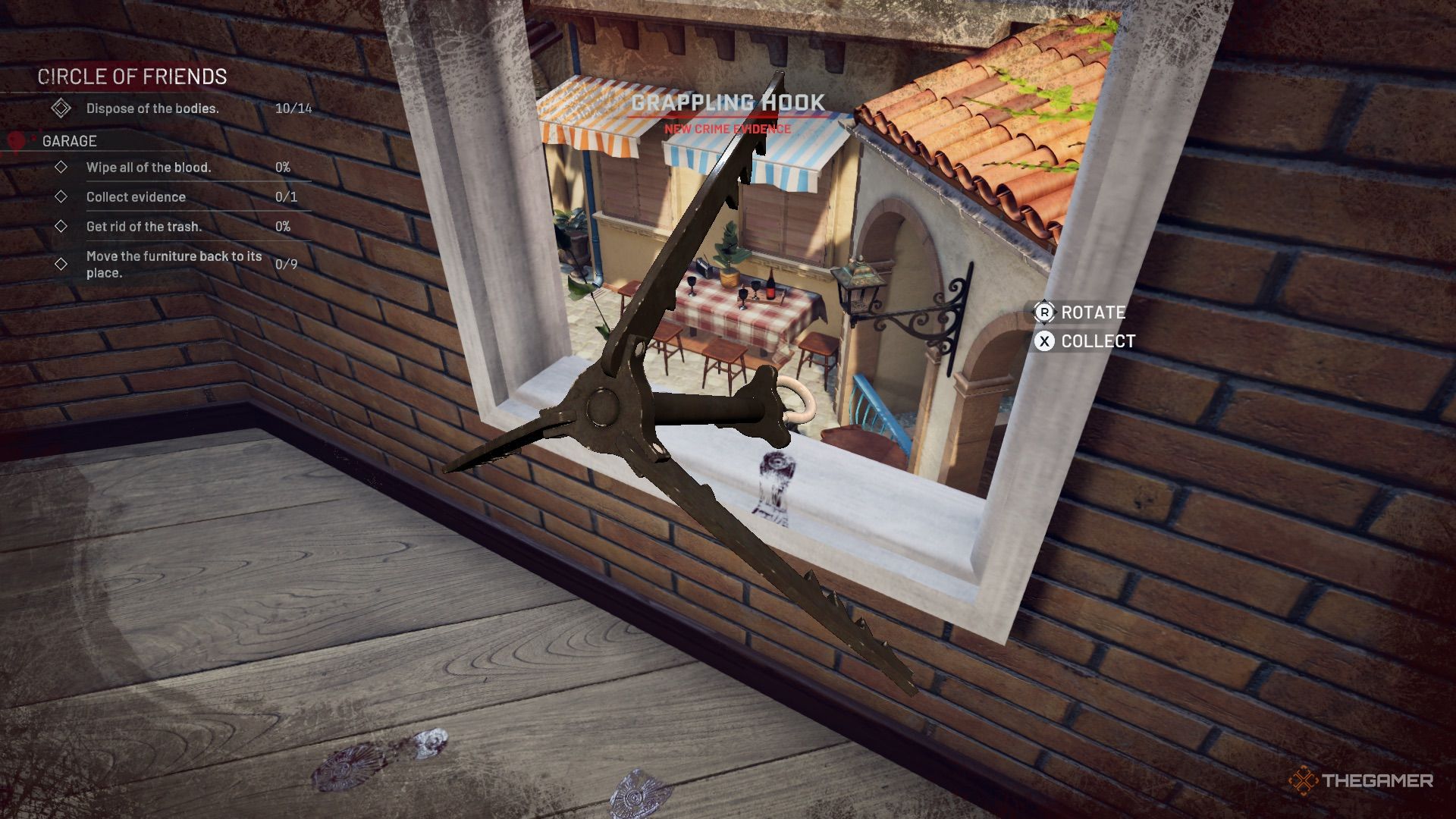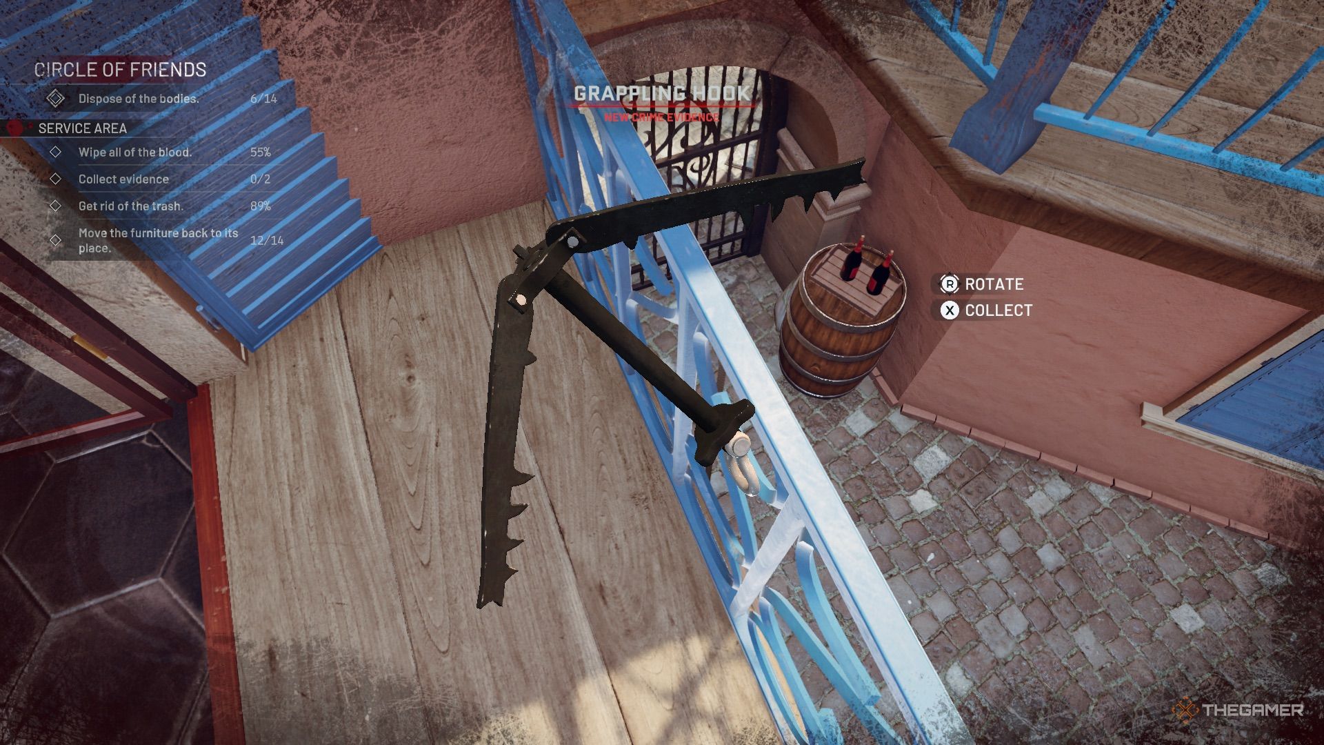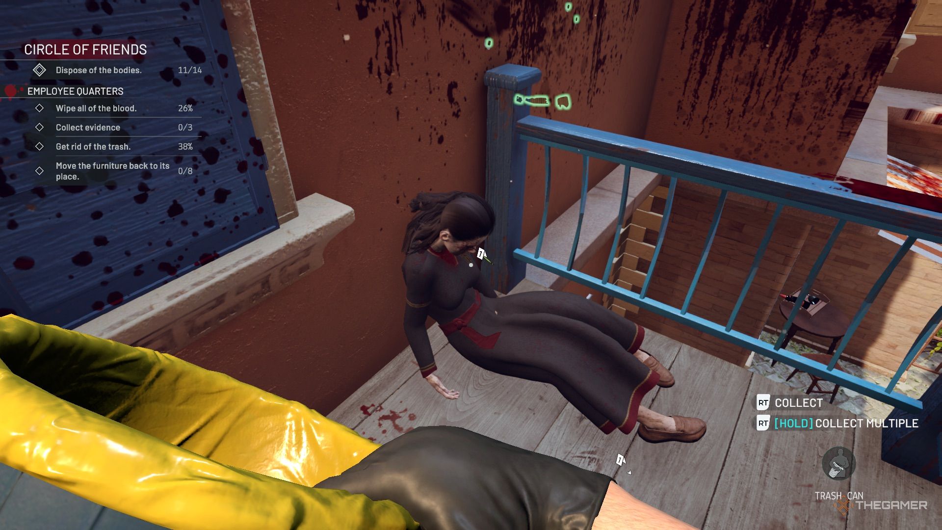 阳台上有尸体和证据,还有血迹需要清理。将尸体扔到地上稍后处理,并清理弩箭(证据)和步枪(证据)。旁边还有一点现金。