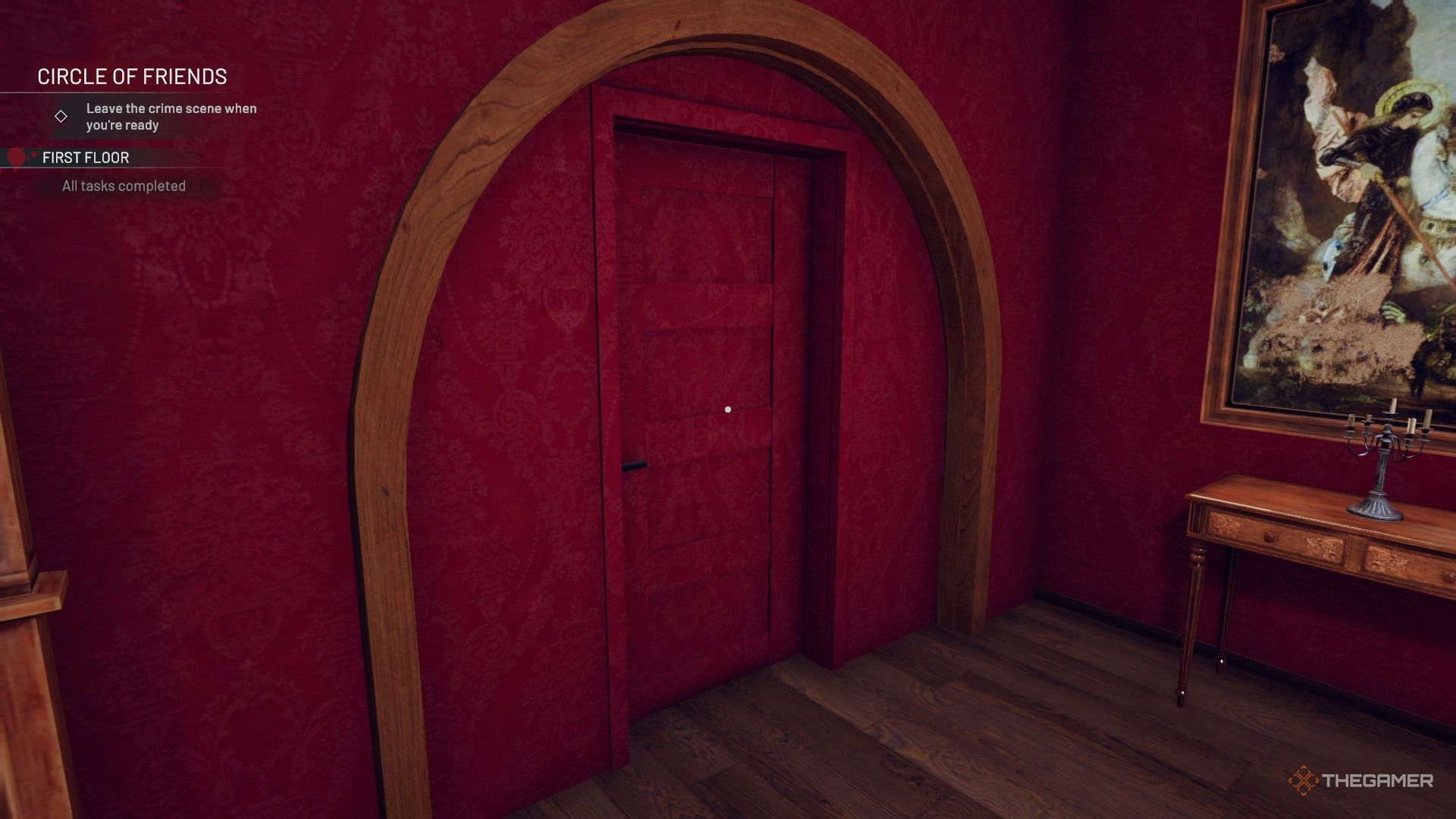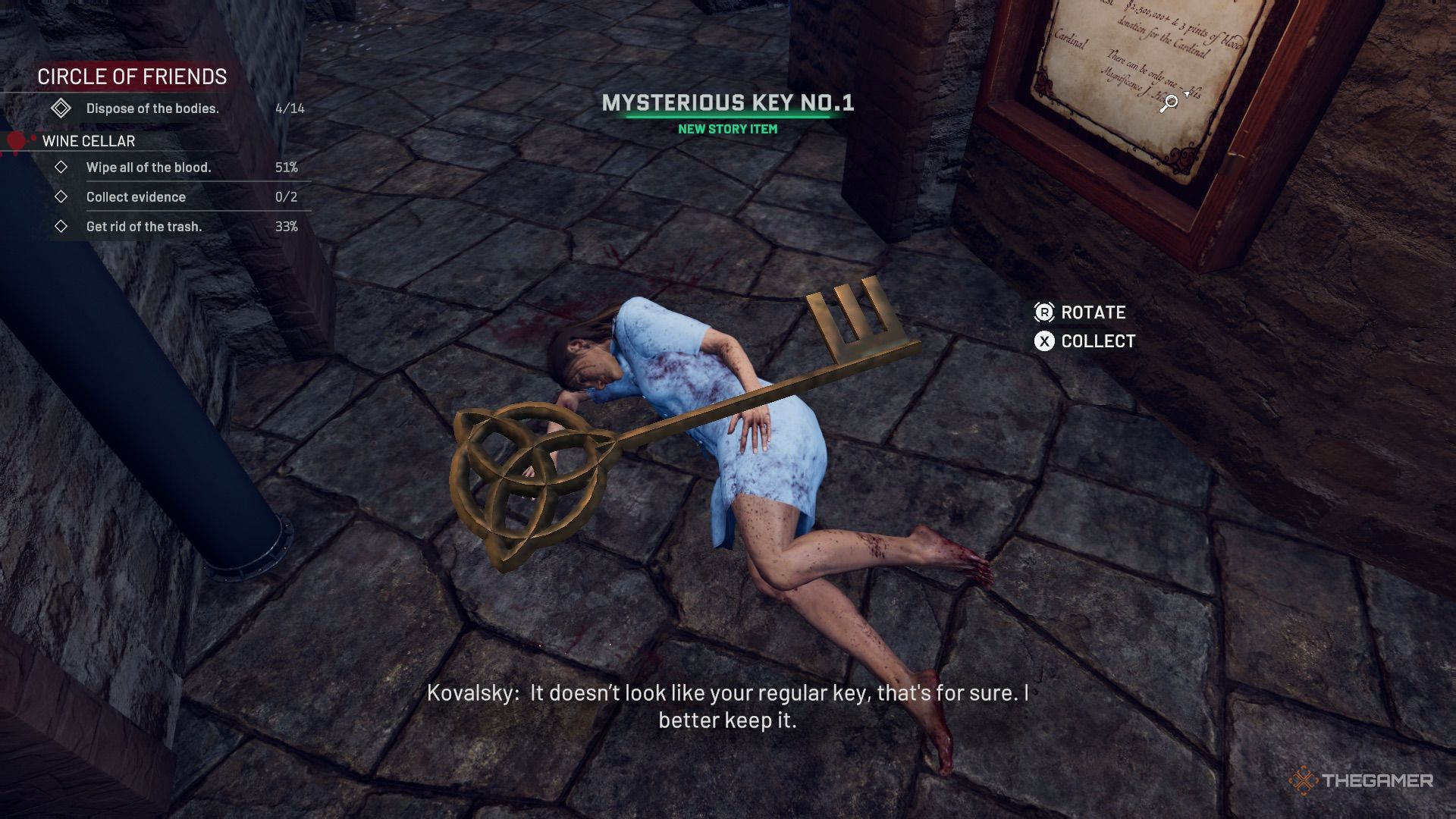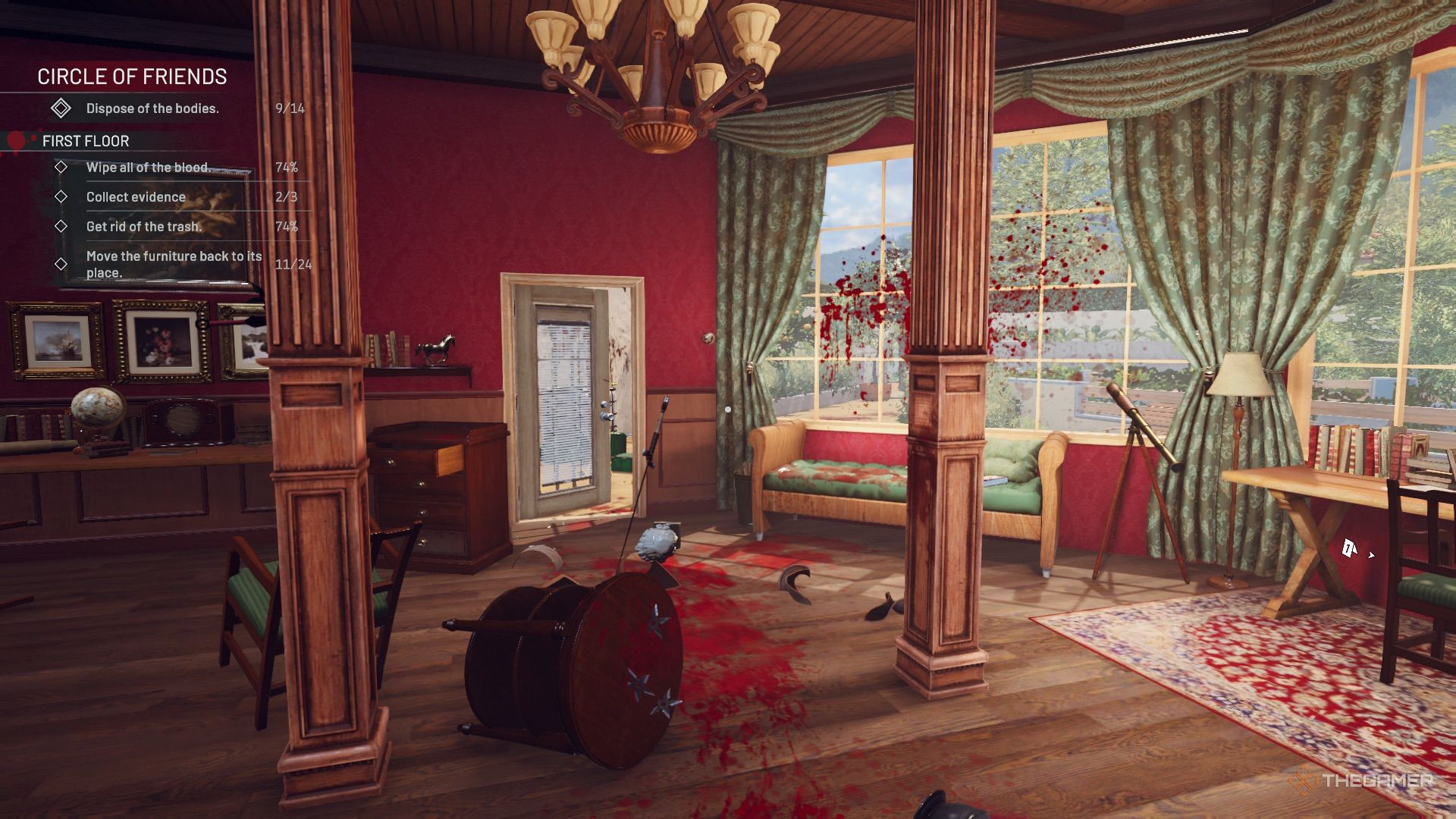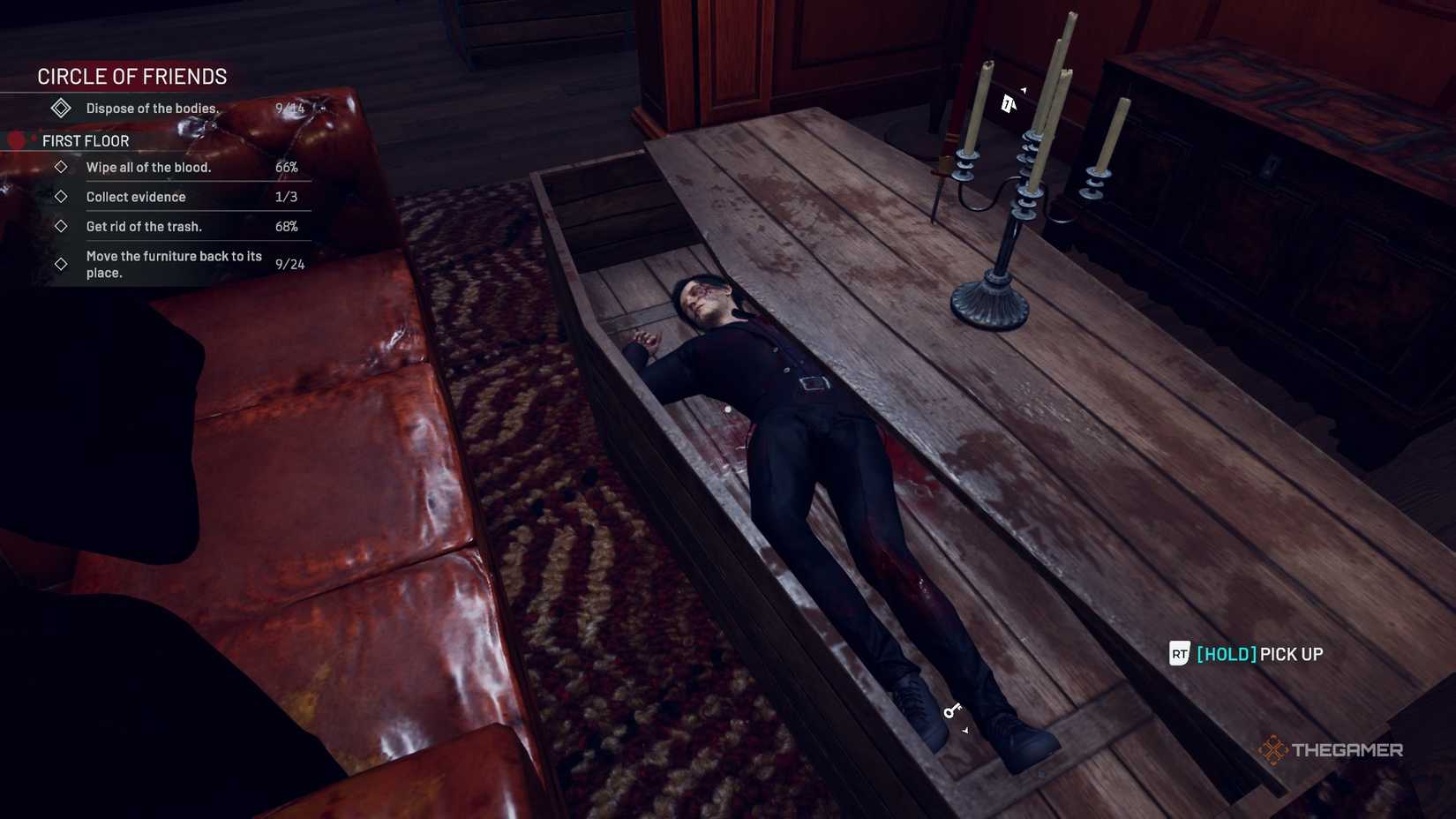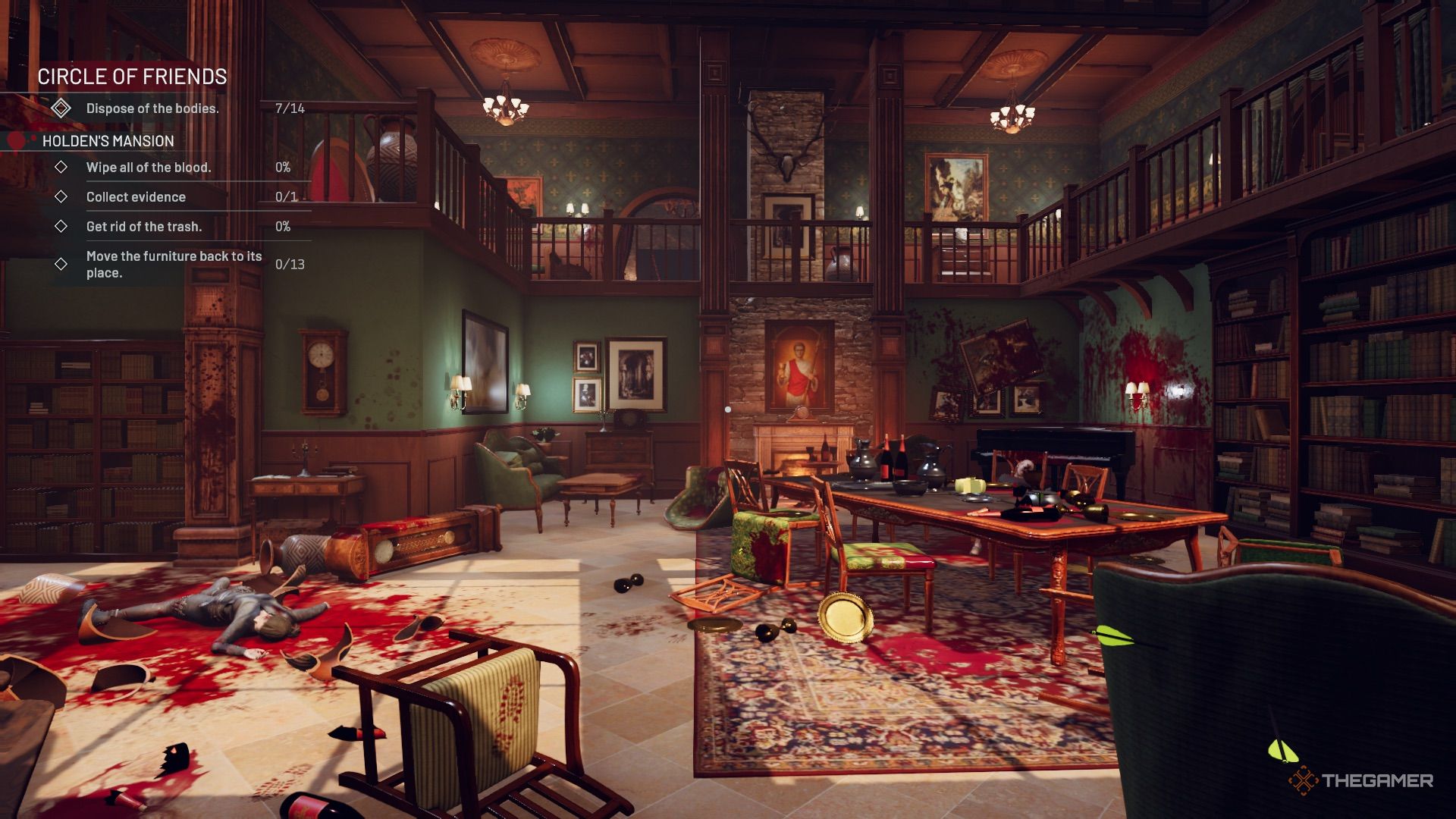 回到厨房,在您归还托盘的架子附近有双门。左边第一扇门通向霍尔登的豪宅。房间里满是血迹,还有很多家具需要清理和安置。尸体坐在长桌旁的一张椅子上,另一具尸体位于房间的左侧。