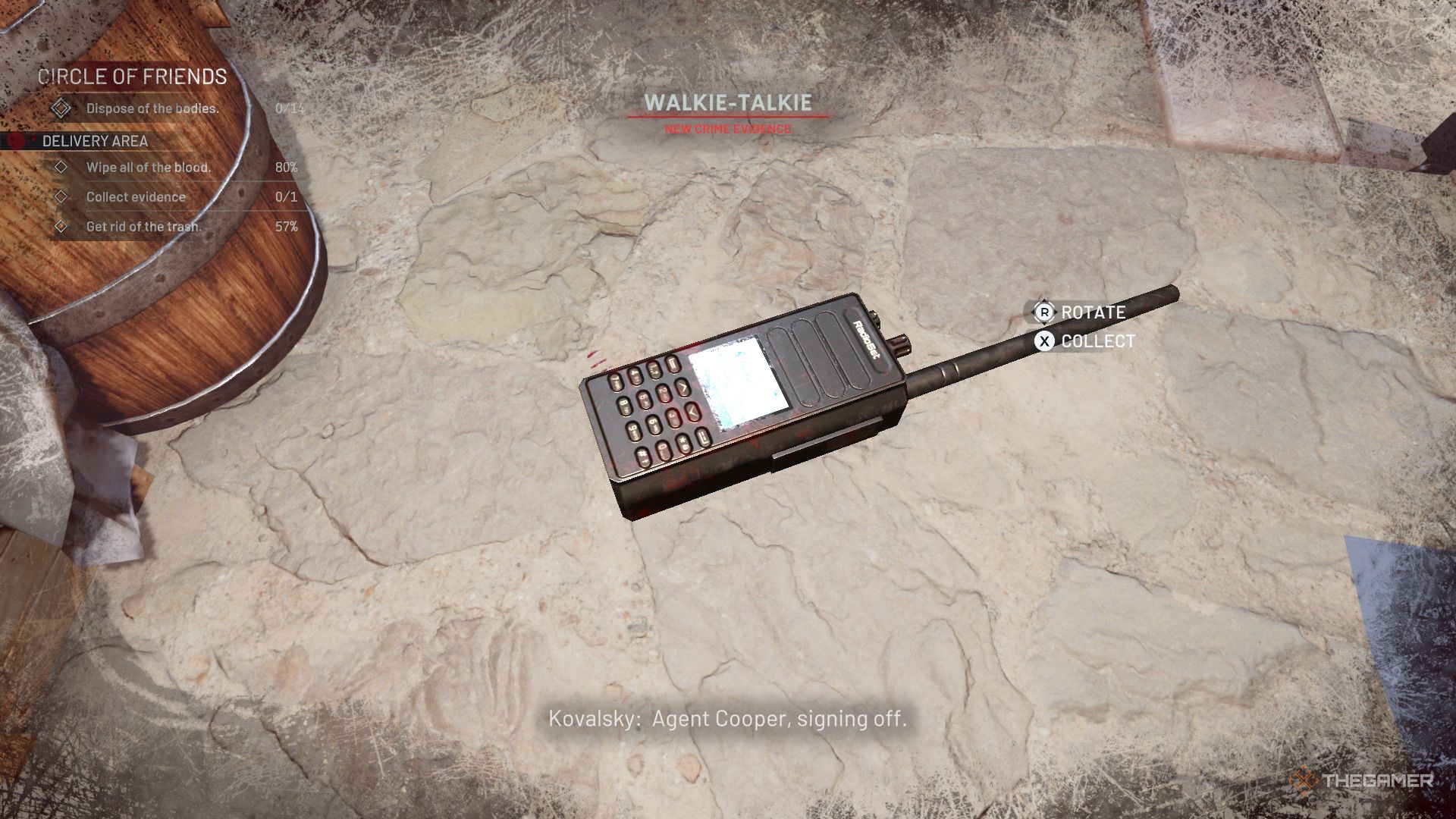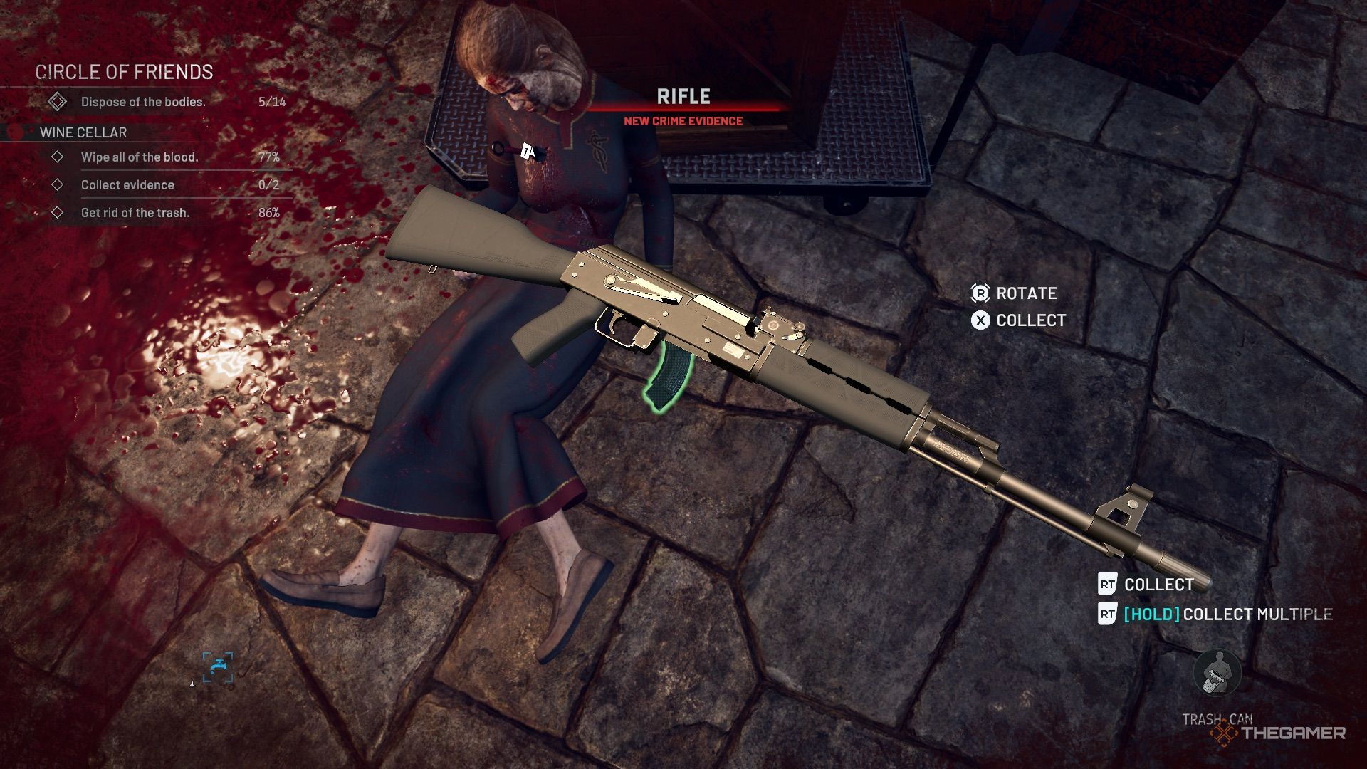 隔壁房间有一堆需要分解和移走的桶,还有一张坏了的桌子。有一个桶位可以补充和清洁您的工具。在删除尸体之前拾取步枪(证据)和苦无(证据)。