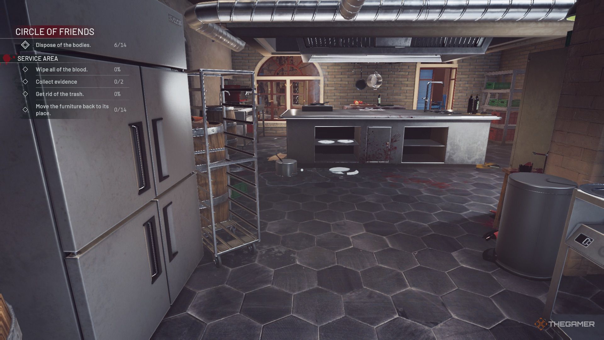楼梯上方的门通向员工宿舍,那里还有另一个桶点。楼梯最下面是送货区的门,一个尸体,一个需要拆卸的桶,一个煎锅需要返回厨房。