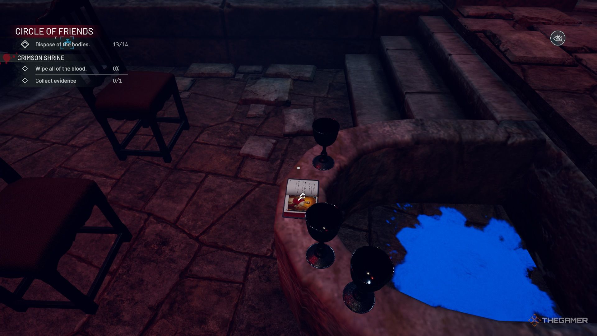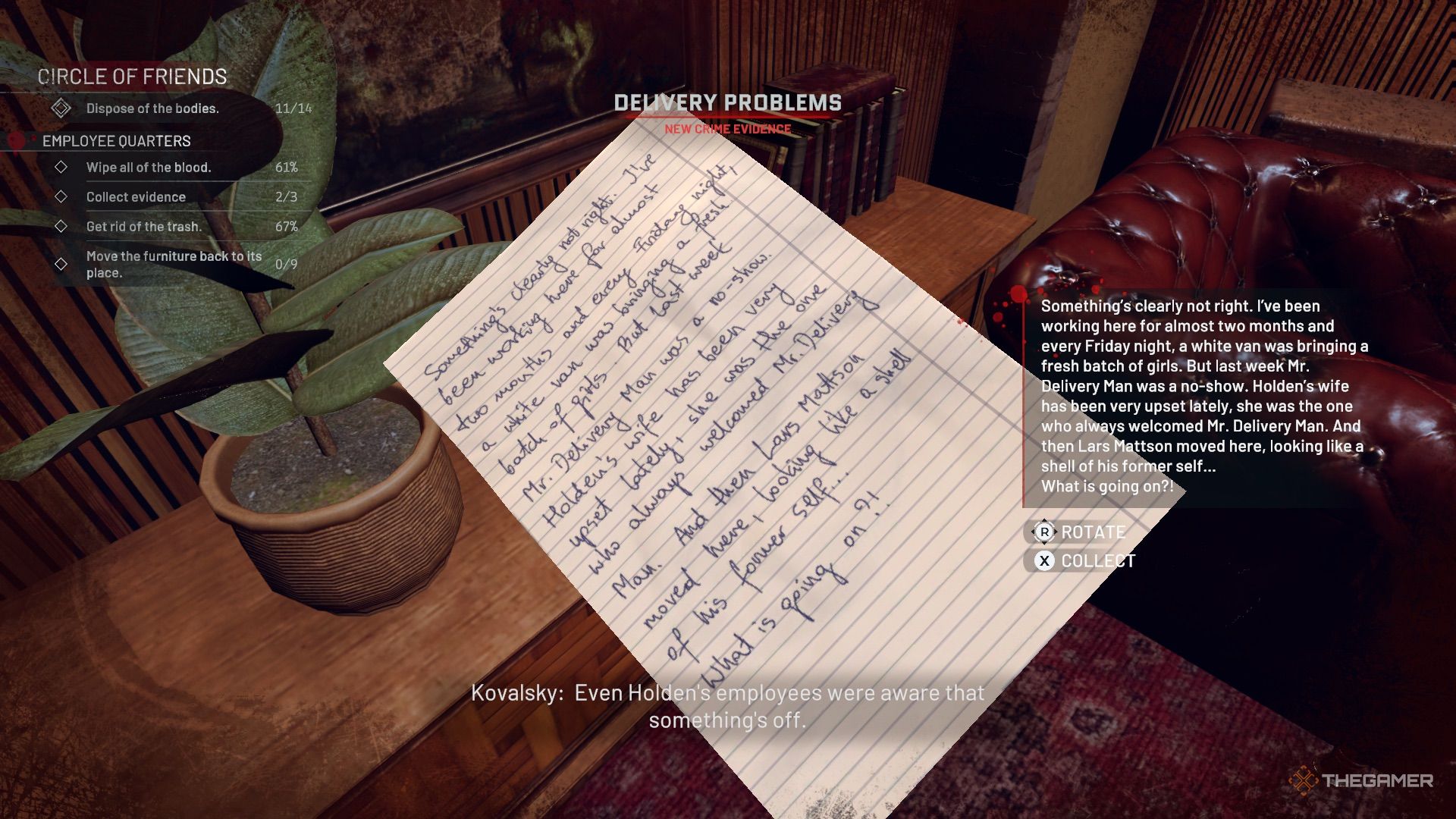 房间左边有一个信(证据)和一些需要清理的血迹和家具。缺少一把椅子,可以在下面的庭院中找到。