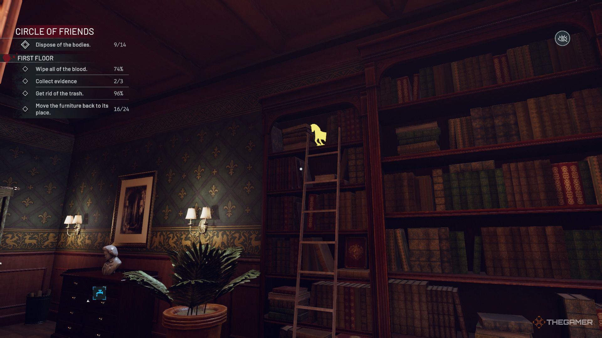 上楼后,可以在正前方的书架上找到贵重雕像。左边有一个书架,里面有很多破瓶子和洒出来的酒。书架在擦拭干净之前无法移动,因此请检查顶部是否有血手印。