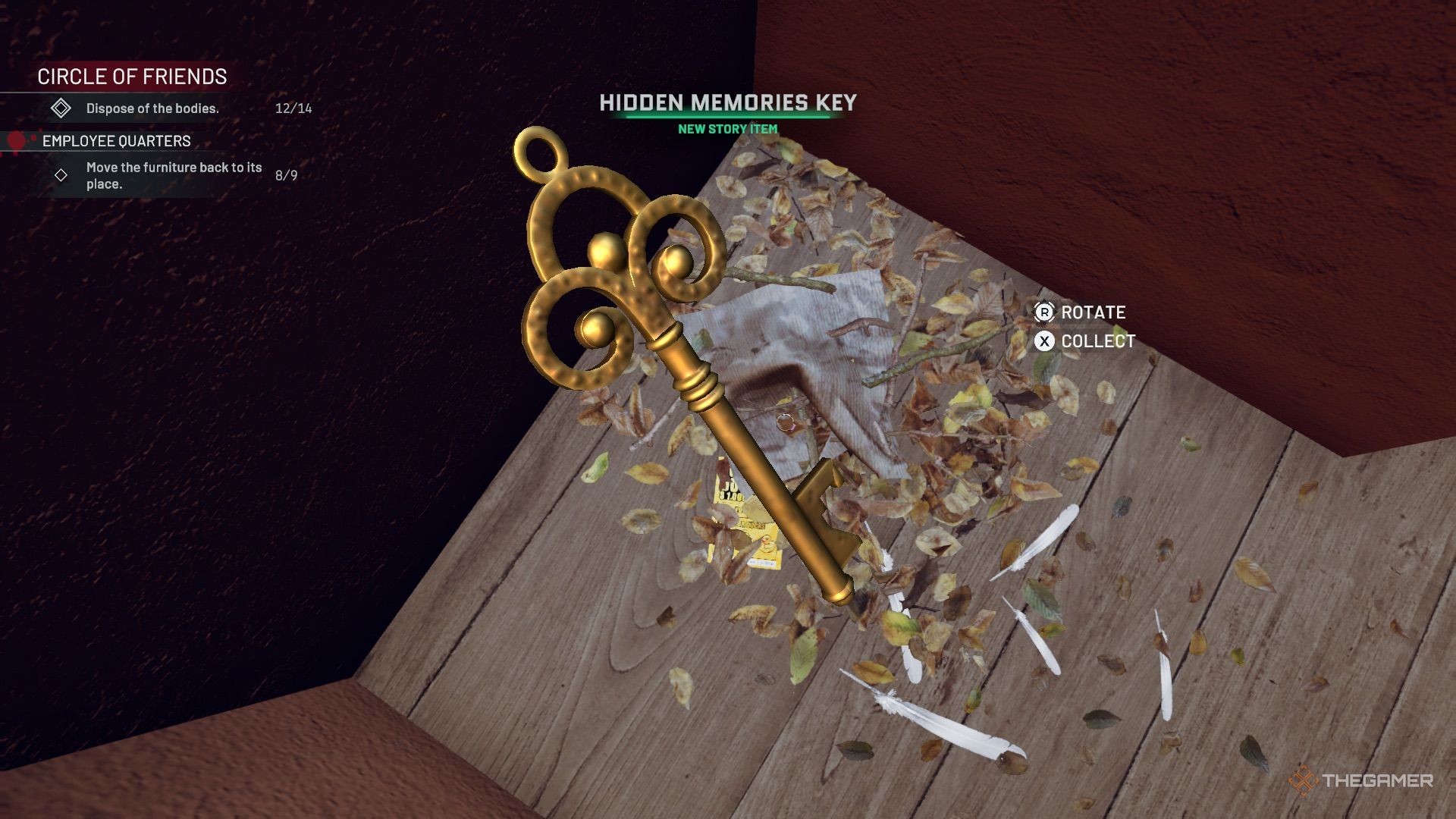 从车库回到楼上,打开窗户。蹲下身子,沿着左边的壁架到达员工宿舍。在你去阳台之前,绕到左边的拐角处,找到一个小空间,里面有羽毛和很多贵重物品,以及一把钥匙。