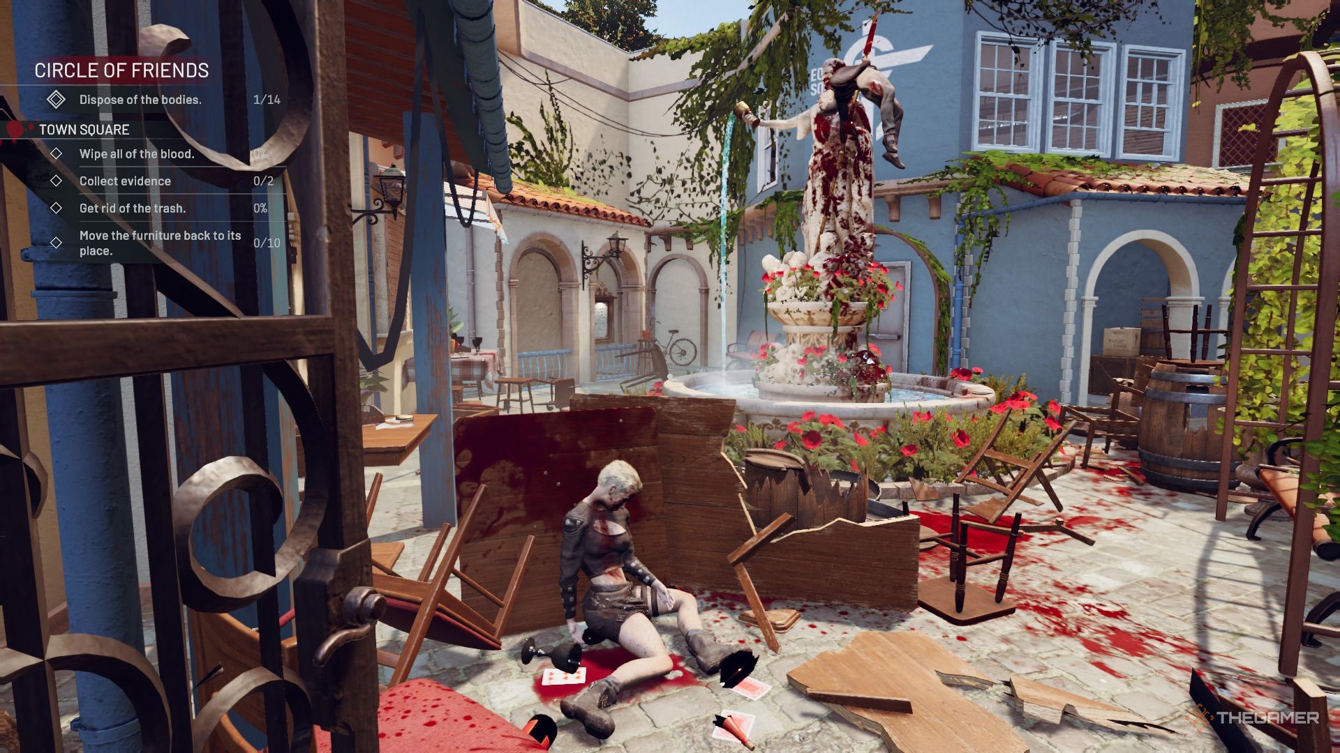 三具尸体镇广场区域一片狼藉,周围有大量血迹和破损的家具。首先从入口、喷泉顶部和右侧破碎桌子后面移走尸体。