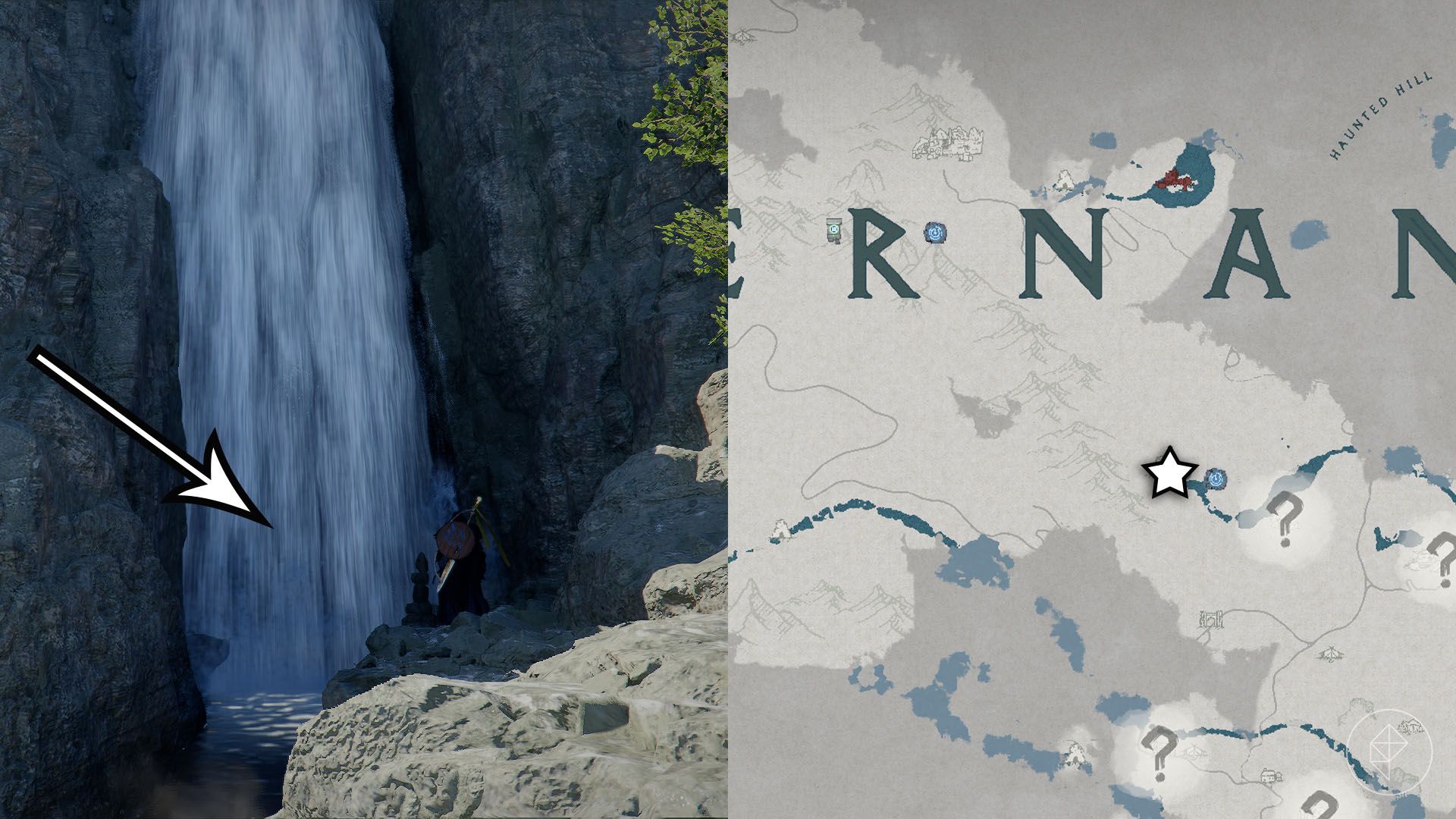 入口隐藏在另一个瀑布后面,你需要使用刺杀技能才能穿过它。进入后,打开装有靴子的箱子。