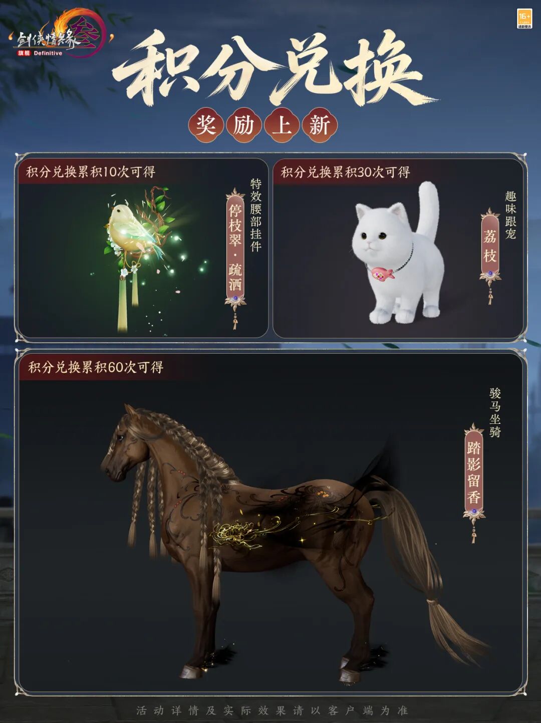 参与新一期积分兑换90次,即可获得二代复制品外观“画社·闹智”;参与新一期积分兑换60次,即可获得坐骑“影留香”,还有特效腰挂和可爱宠物,助你解锁更多乐趣!