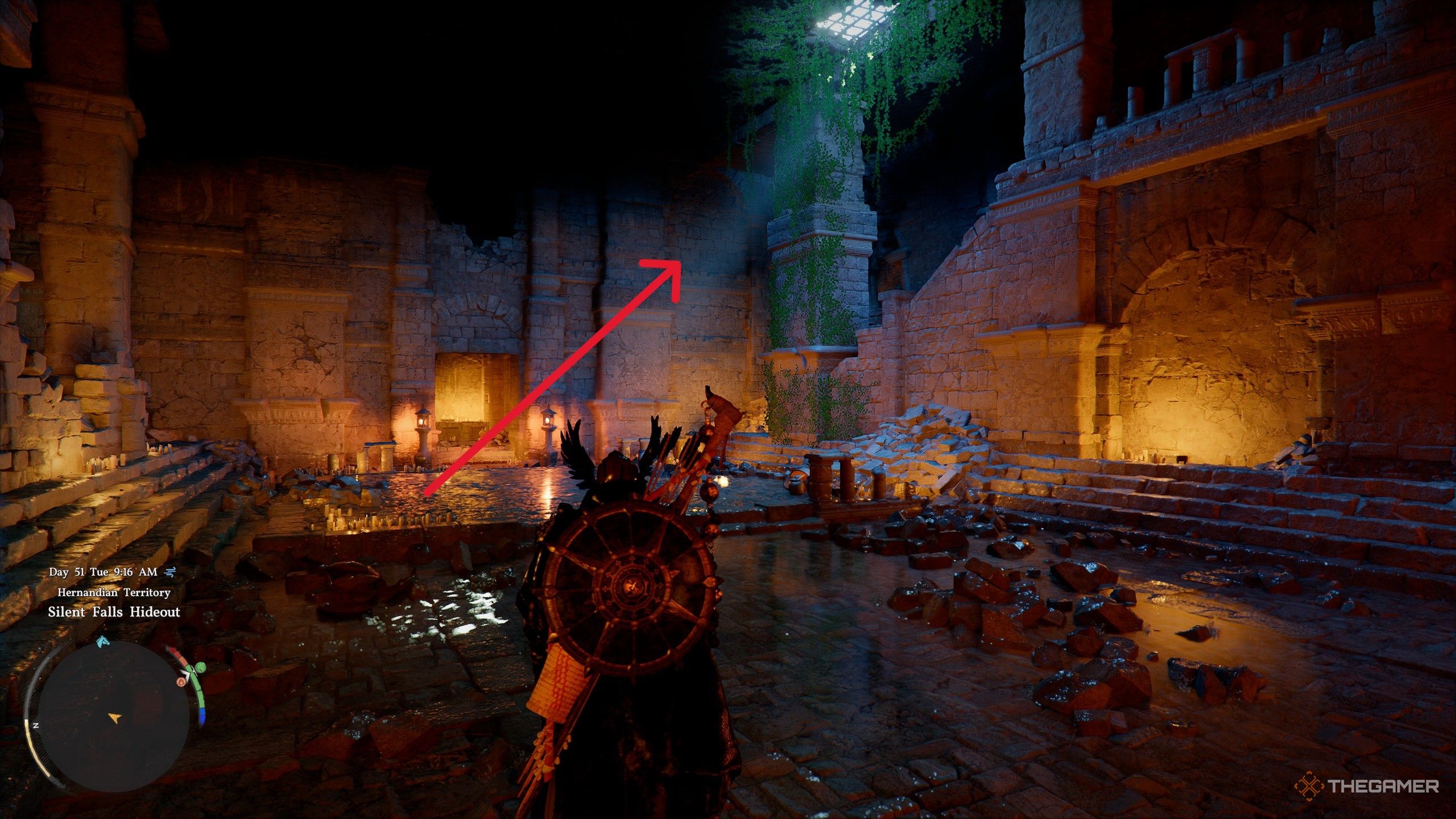 墓穴行者死亡后,前往房间的右上角(如上图所示),在左扳机键让匕首插入墙面的同时,对着墙壁施展“力之掌击”。这将打开一扇秘密门,带你进入一个秘密房间,里面有一个箱子,里面有一件灼热板斗篷。