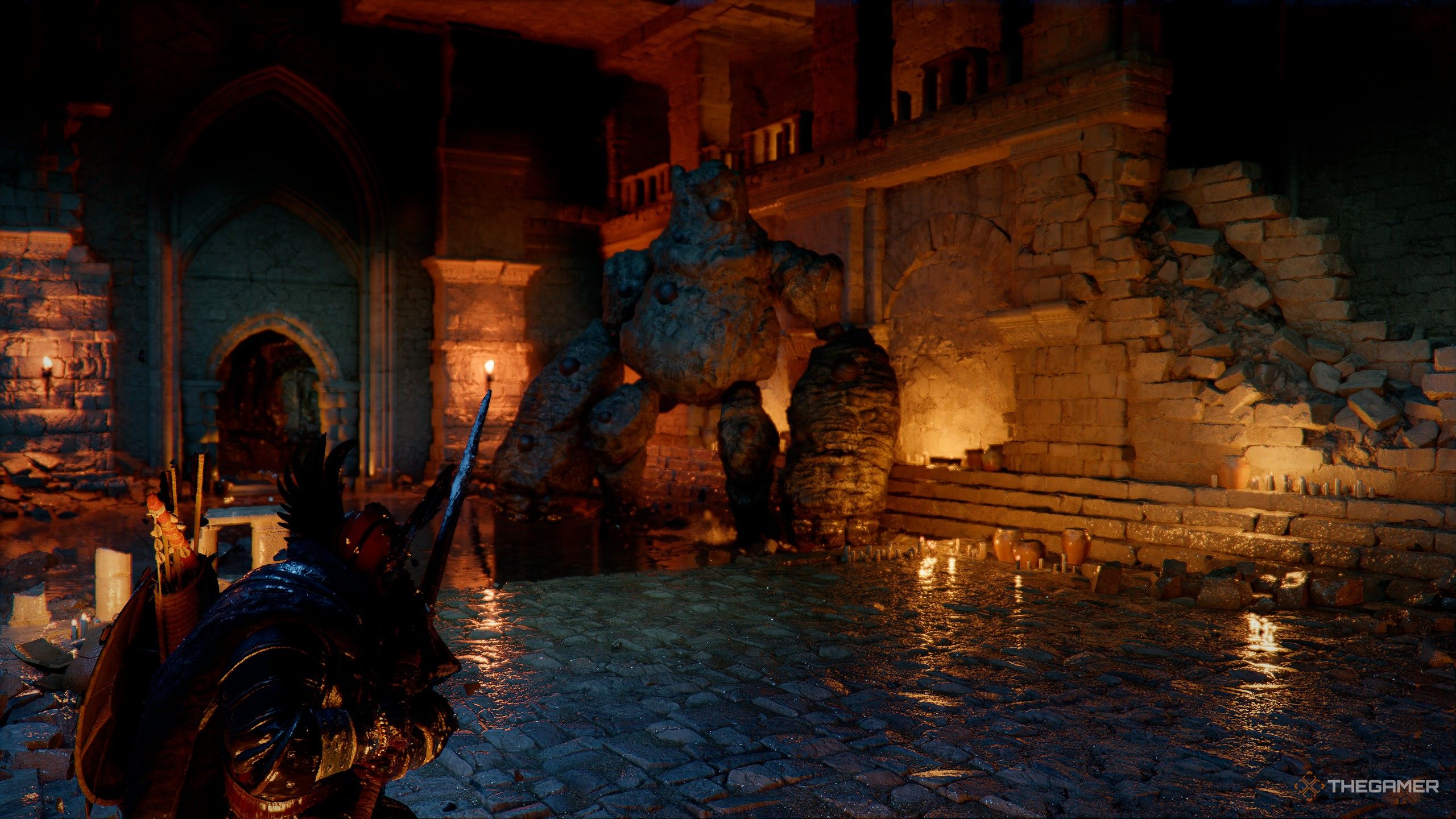 从找到手套的地方离开瀑布,立即左转进入另一个洞穴系统,它会通往一个巨大的房间。在房间里,一堆巨石会形成一个名为“古墓行者”的Boss。不要被它的体型吓倒,这个敌人其实很容易对付。