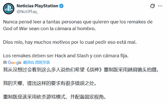 博主@NotiPlay_第一个提出质疑,表示他不明白为什么这么多人希望重制版采用“过肩视角”(类似于《战神5》)。他坚持认为,作为一款硬核动作砍杀游戏(Hack and Slash),重制版《战神》必须保留经典的固定视角,以保证战斗逻辑的纯粹性。