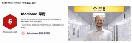 总评分:《8号出口》 偶尔能让人眼前一亮,但灵感只是断断续续地闪现。主创改编这款游戏的想法在理论上是值得肯定的,但它无法支撑故事片的长度。一些观众可能更喜欢影片压抑不安的氛围和扎实的制作水准,但一旦仔细观察影片中为了贴近传统叙事而添加的新设定和情节,观影体验很可能会大打折扣。