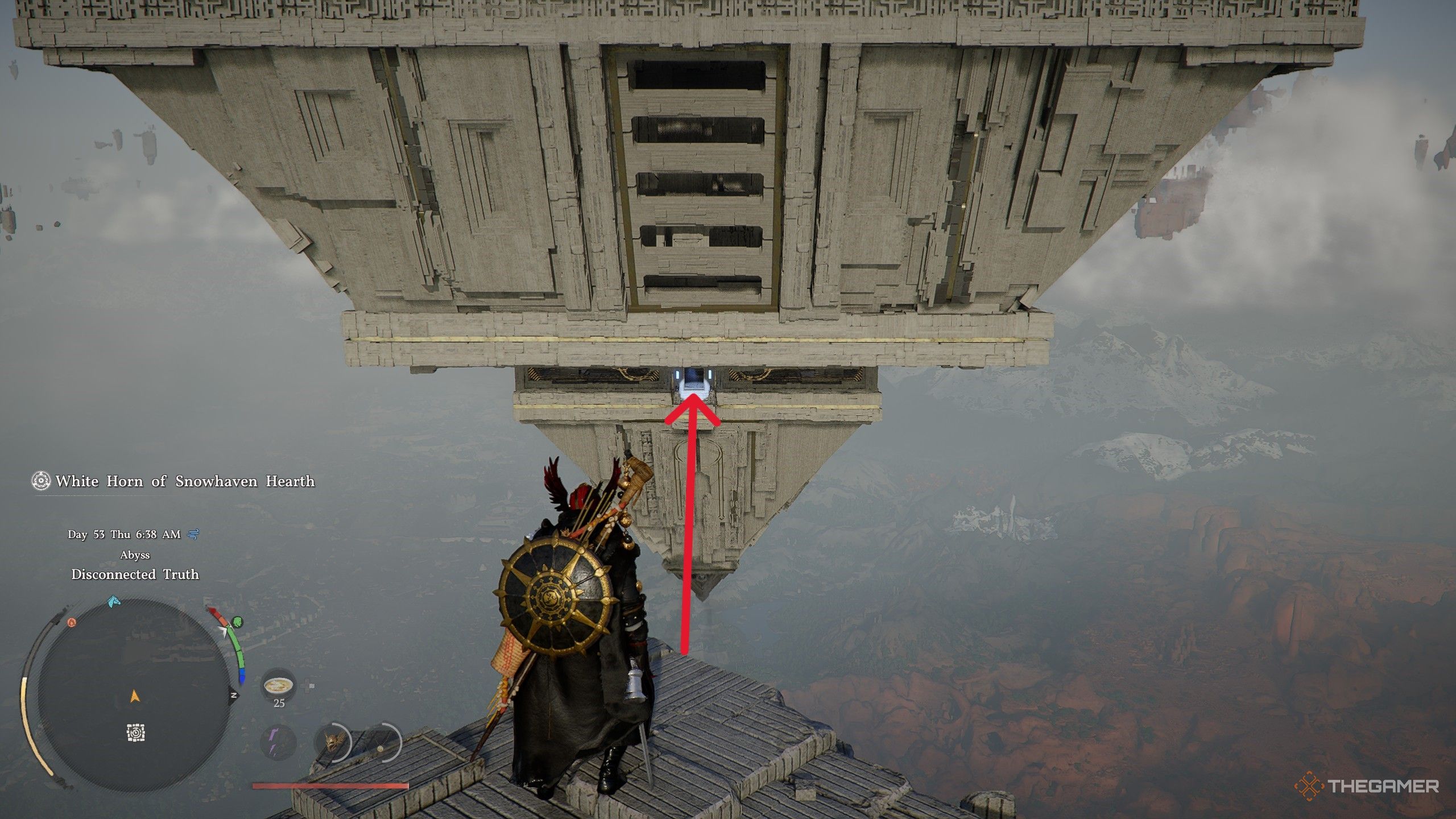 到达楼梯顶部后,请看向巨大的倒三角形。沿着它的右侧,会有一个发光的蓝色深渊核心,你可以抓取。跳到它附近的平台,在空中按R3二段跳,然后滑翔到它附近。现在在空中使用公理之力,抓住深渊核心并将其移近倒三角形周围的走道。
