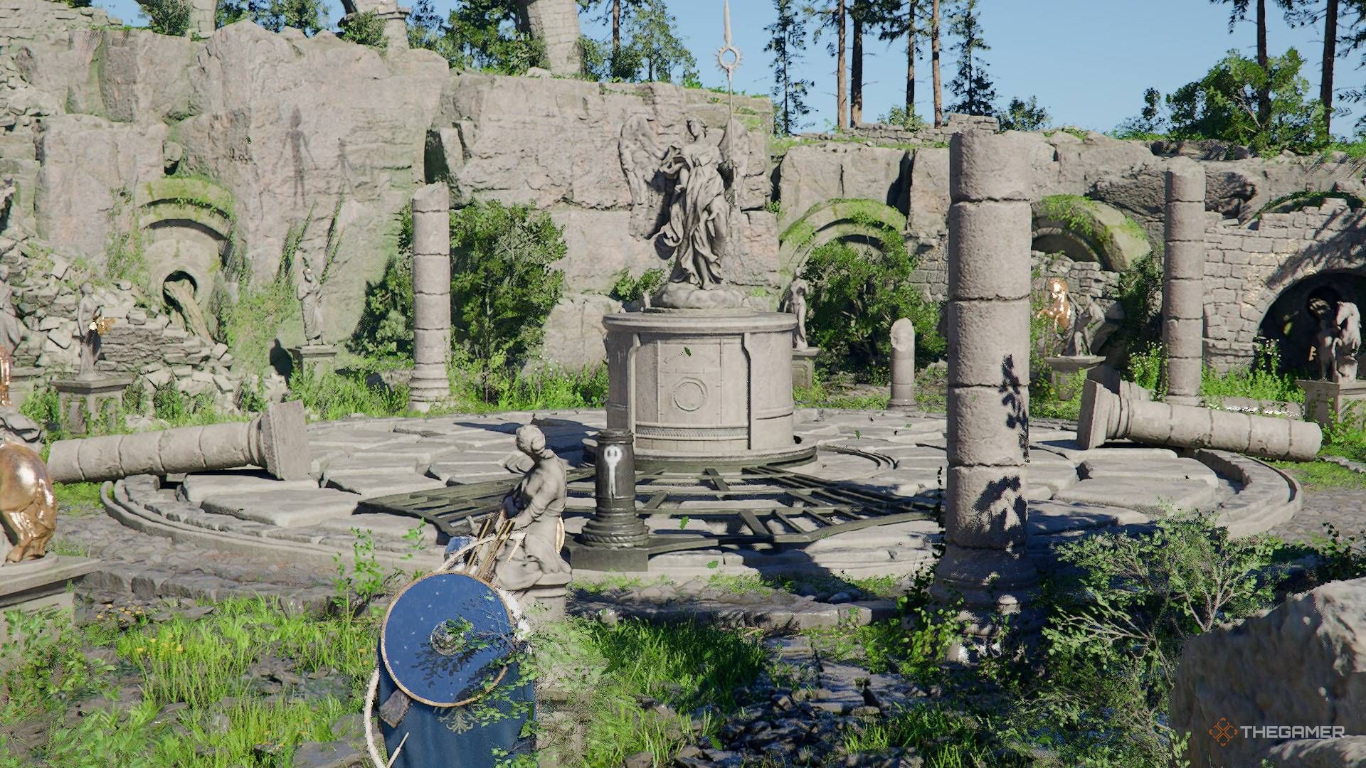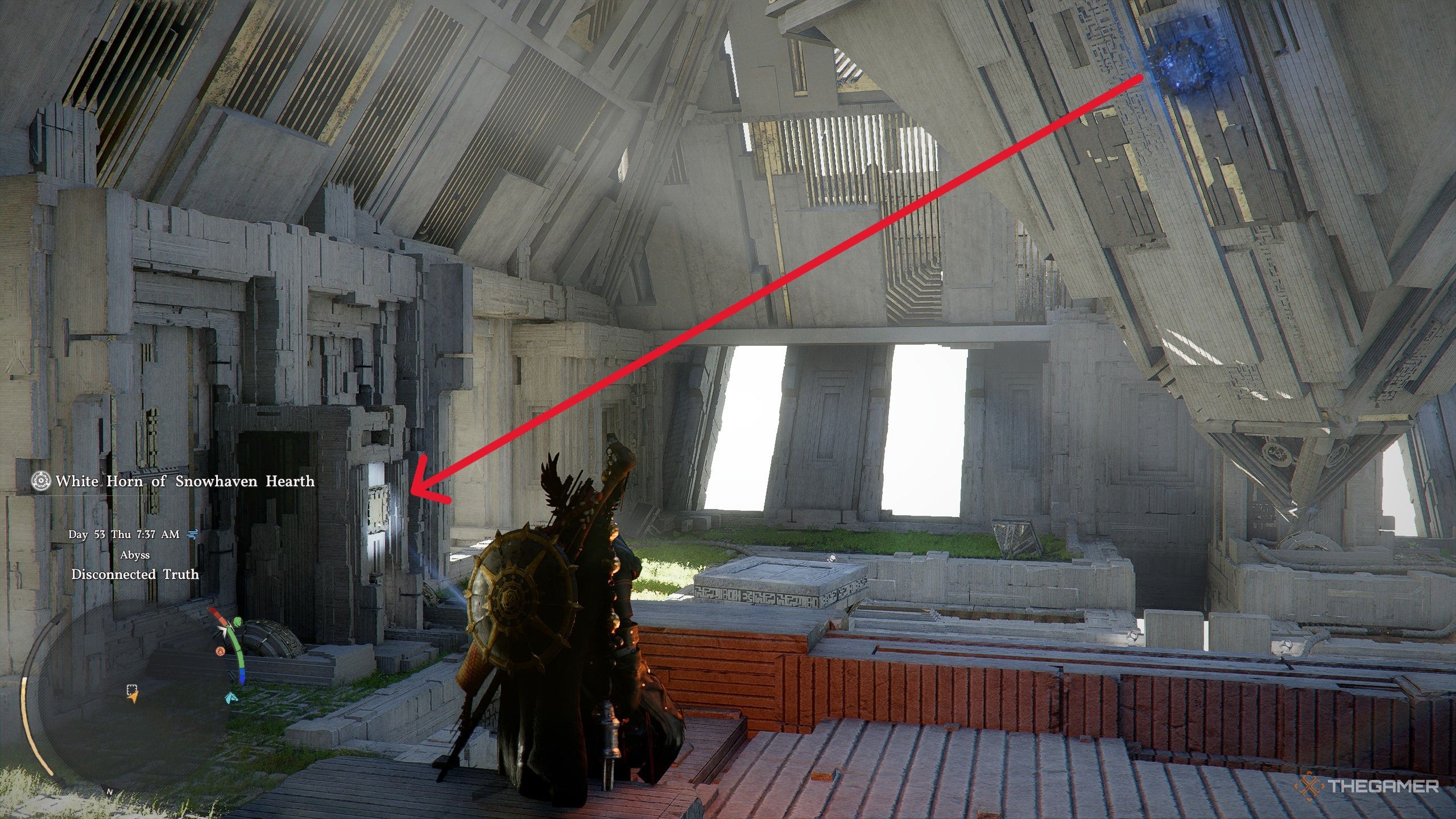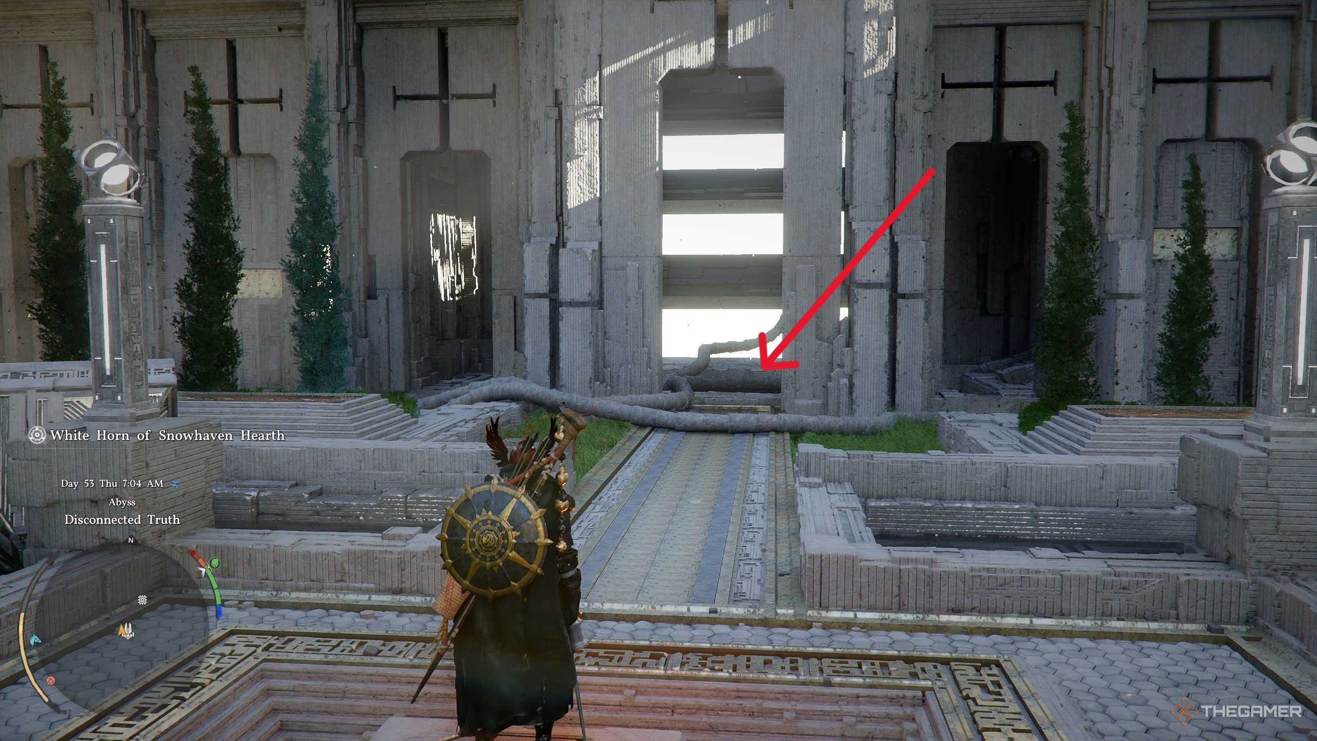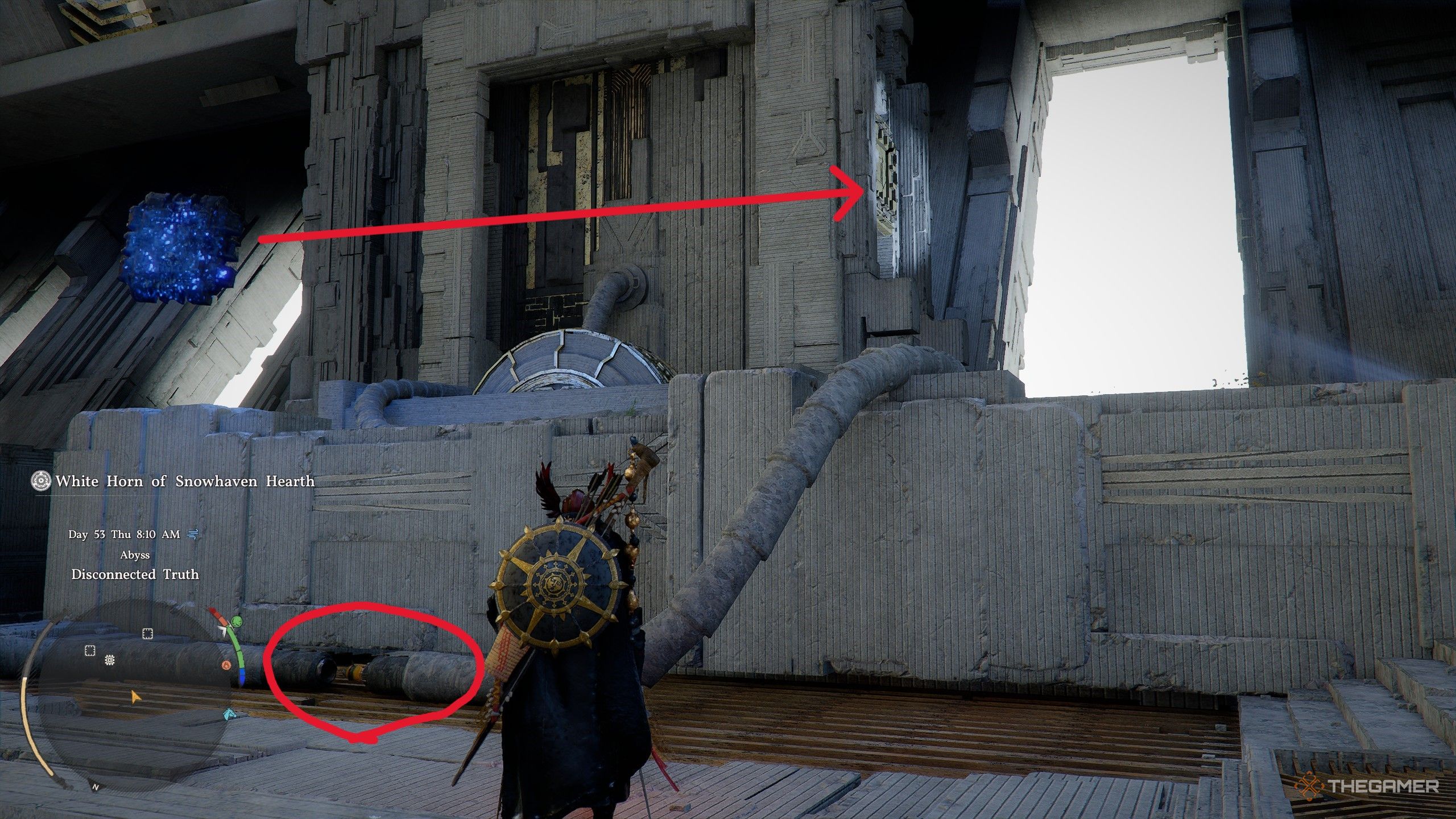 直接从你获得这个深渊核心的上方洞口,你会看到另一台大型机器,其右侧有一个深渊核心插槽。需要放置核心的地方会有聚光灯亮起,所以应该不难找到。此外,一旦您使用Palm of Force 将核心推入到位,就在这台机器的正前方还有一个需要修复的导管(上图中已圈出)。就会与三个开关中的最后一个建立电源连接。用公理之力激活那个开关,以打开位于你一直在击打的小开关上方的大型中央开关。爬上去并使用力量之掌按下大开关即可完成拼图。现在你只需要爬上倒三角形平台即可到达顶部的祭坛,深渊遗迹将在那里生成。