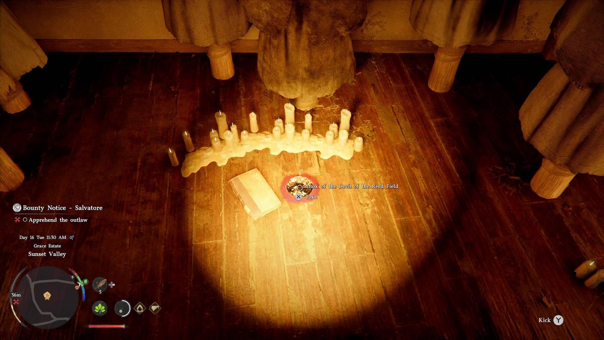 进入最北端的建筑,你会发现一群人体模型站成T字形,都戴着布制头盔,就像芦苇魔的爪牙所戴的那样。地板上“里德菲尔德恶魔面具”旁边有一本名为《日落谷传说》 的书。如果你拿走这个面具,将会触发无限的敌人。