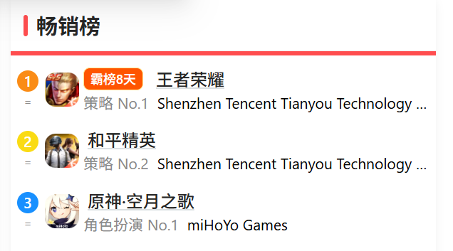 4月8日,《原神》更新了六月版本,卡池新增五星级摇滚人物莉娜娅。角色形象既可爱又数值感强。截至目前,《原神》已升至App Store游戏畅销榜第3名、整体畅销榜第6名。五月版闯入游戏畅销榜前三后,再次展现出强劲势头。