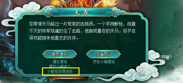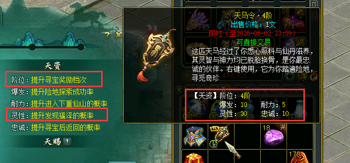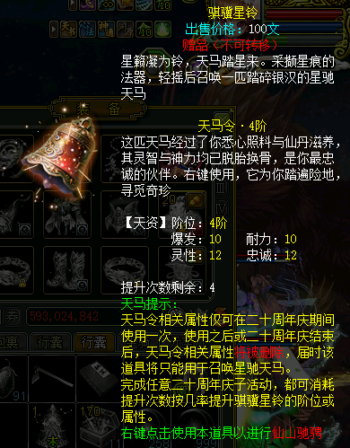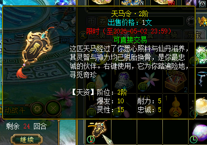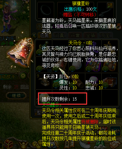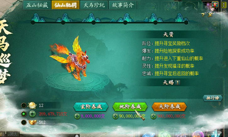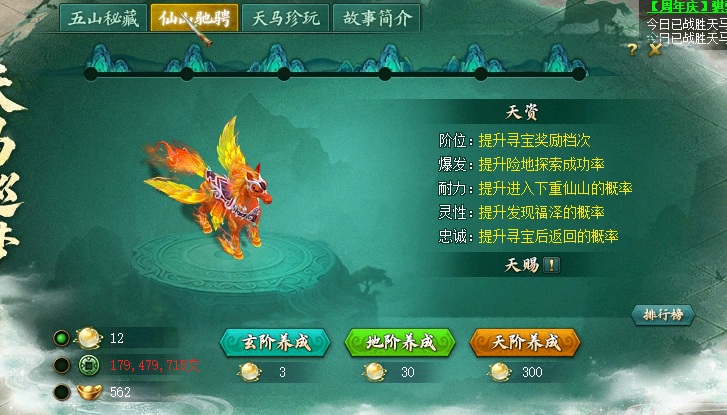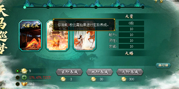 选择的修为等级(玄/地/天)越高,提升天马等级(1-6级)的概率就越高。 The more fairy manes you can get.
