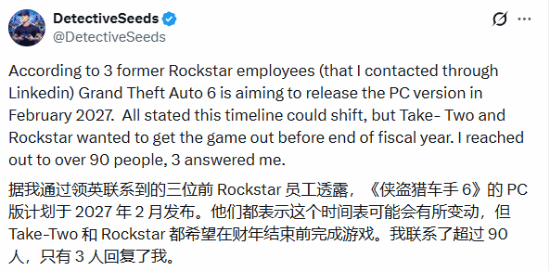 DetectiveSeeds 通过LinkedIn 联系了90 多名Rockstar Games 前员工,只有三人做出了一致的回应。根据这三位消息人士透露,PC版计划于2027年2月发行,核心原因是发行商希望在财年结束前推出游戏,并以创纪录的业绩完成财务报告。