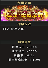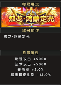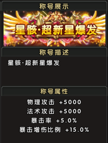 称号属性:物理攻击+5000,法术攻击+5000,暴击率+5.0%,暴击伤害增加比例+15.0%