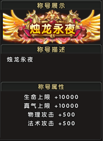 称号属性:生命+10000,真气+10000,物理攻击+500,法术攻击+500;