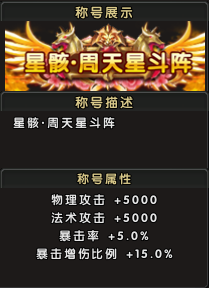 称号属性:物理攻击+5000、法术攻击+5000、暴击率+5.0%、暴击伤害率+15.0%