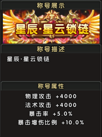 称号属性:物理攻击+4000,法术攻击+4000,暴击率+5.0%,暴击伤害增加比例+10.0%