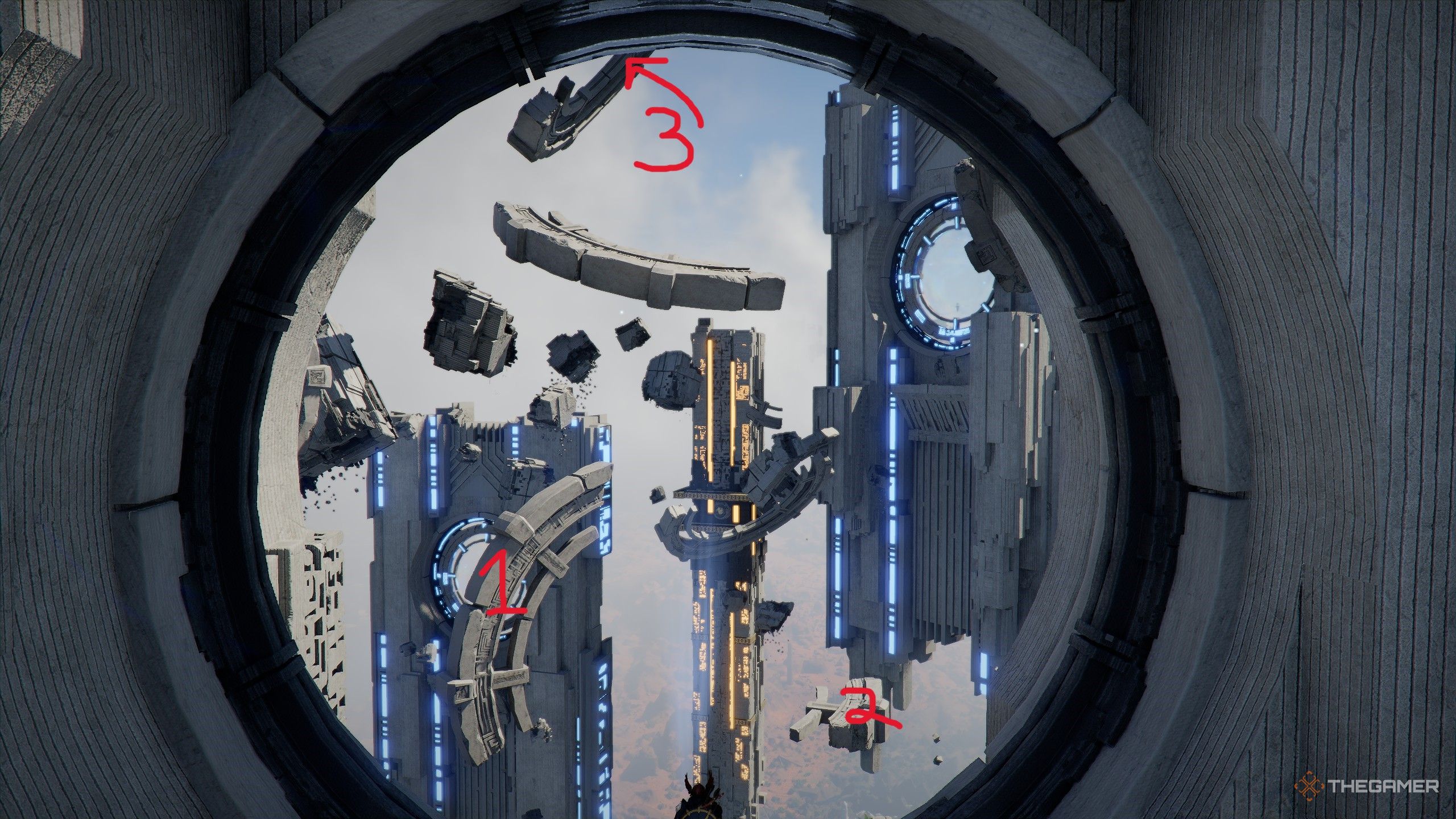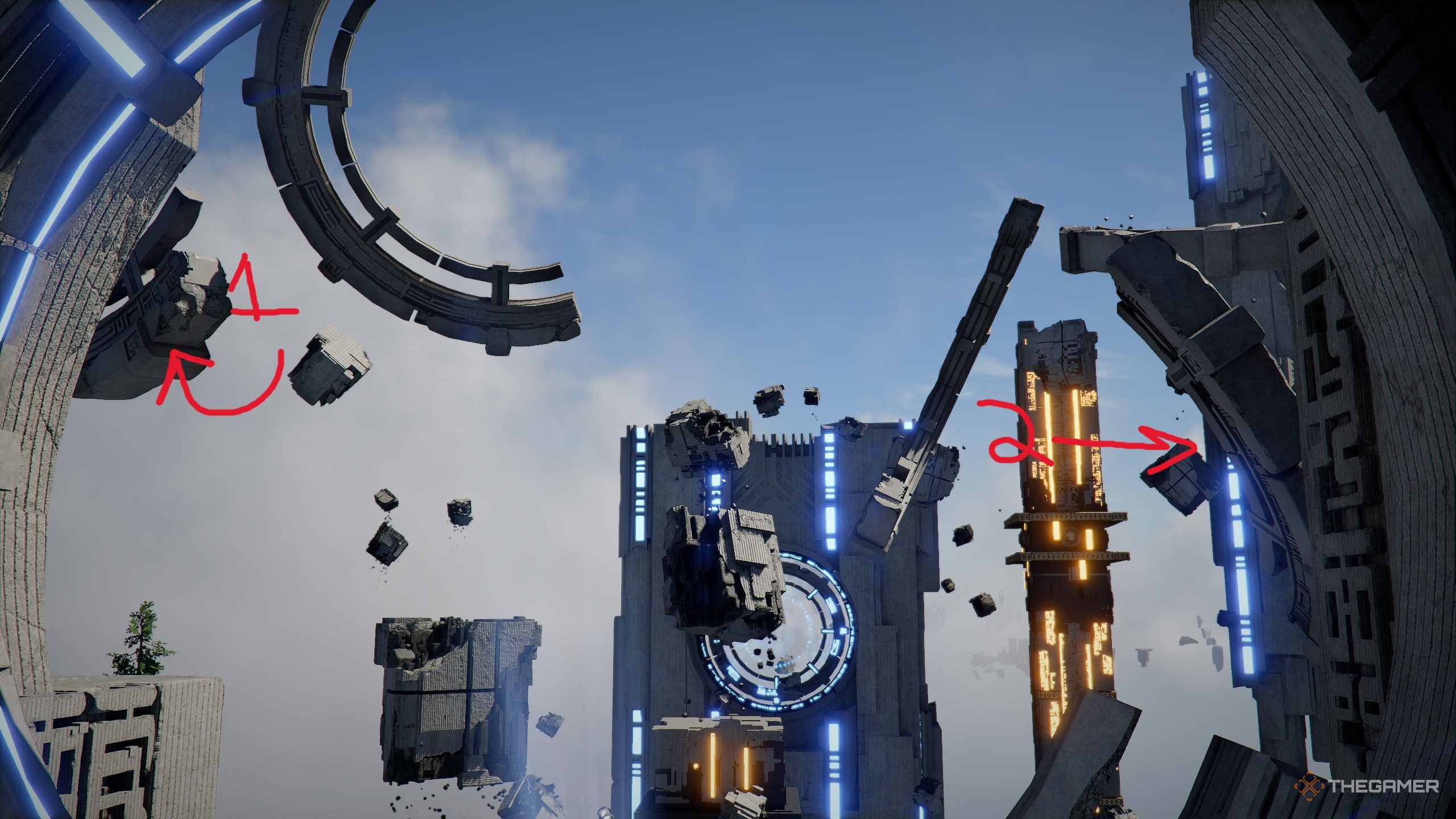 选择最靠近环2 的塔并爬到实际环所在的位置。你现在需要抓住周围漂浮的各个圆环碎片,并将它们插入圆环2以激活它。这是通过使用Axiom Force 抓取碎片并将其拖到环上来完成的,一旦您释放它们,它们就会立即嵌入环中。