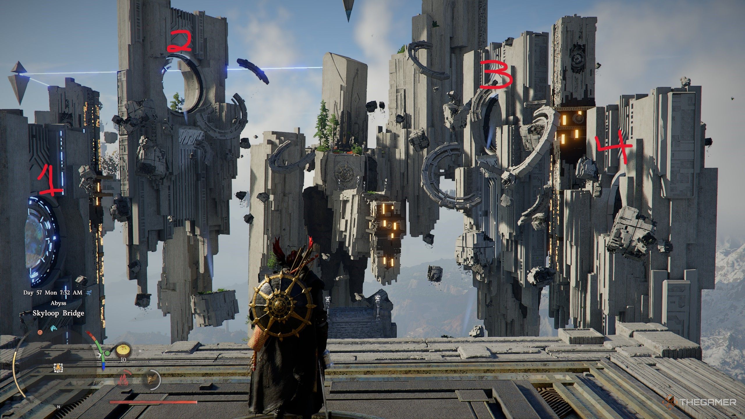 虽然天环桥看起来很吓人,但它实际上是一个非常简单的谜题。当您到达时,您会注意到四个巨大的浮动环,最左边的一个发出蓝光,而其余的则处于休眠状态。为了清晰起见,从左到右,我们将它们标记为圆环1、圆环2、圆环3和圆环4。你的目标是让圆环2、3和4像圆环1一样变成蓝色。首先跳下到较低的平台,然后沿着楼梯到达左侧的可移动平台。踏上移动平台,对开关使用公理之力,将视角拉回,这样你就能看到移动平台可以连接到的多个塔楼。使用左右触发器选择您想要前往的塔,然后按X (Xbox)/Square (PlayStation) 键将自己发射到该塔。